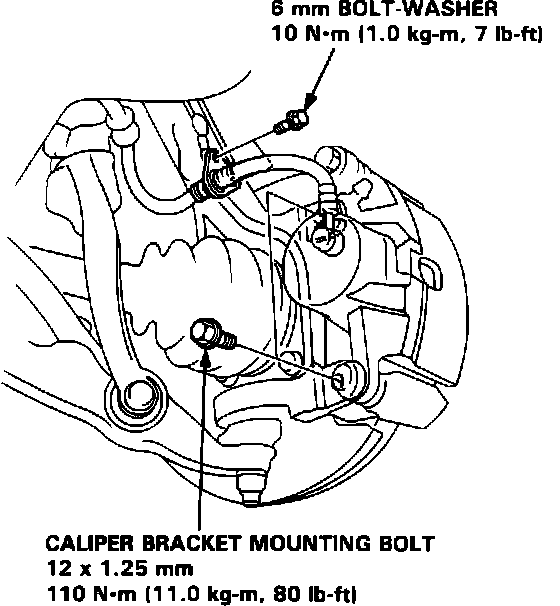 3. Remove caliper bracket mounting bolts and hang the caliper assembly to one side.