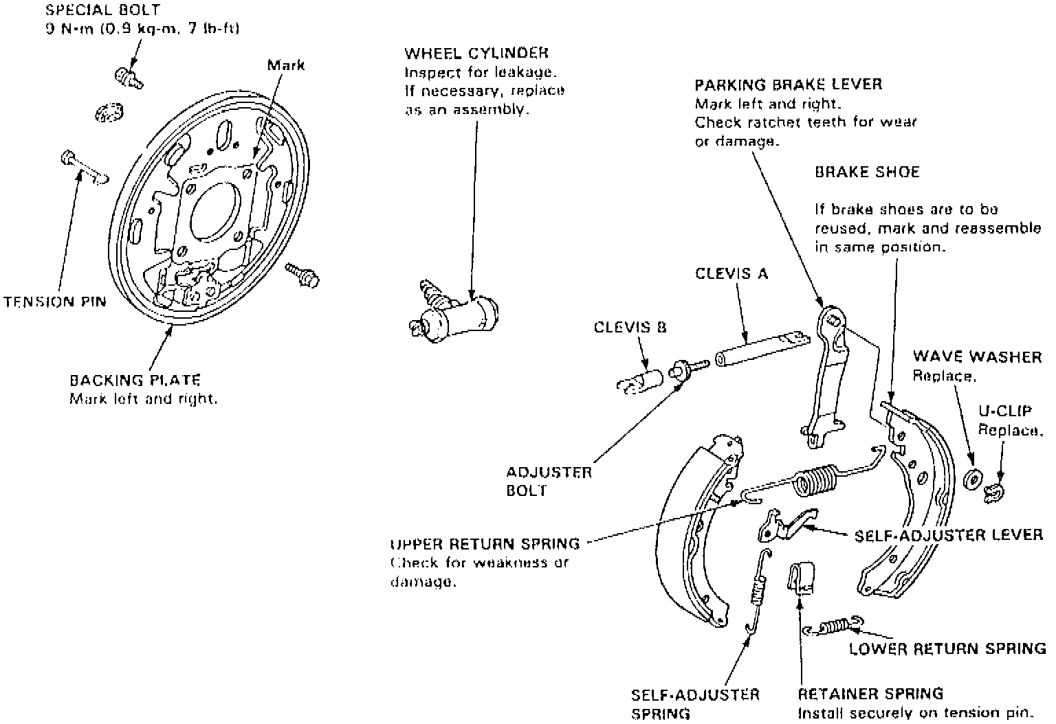 7. Remove upper return spring, self-adjuster lever and spring, then separate brake shoes.