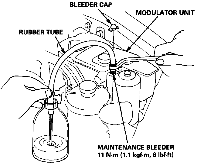 NOTE: The modulator has a capacity of approximately 150 ml (150 cc, 5 FL-oz). Approximately 40 - 45 ml (40 - 45 cc, 1.3 - 1.5 FL-oz) of the fluid is drained at each try.