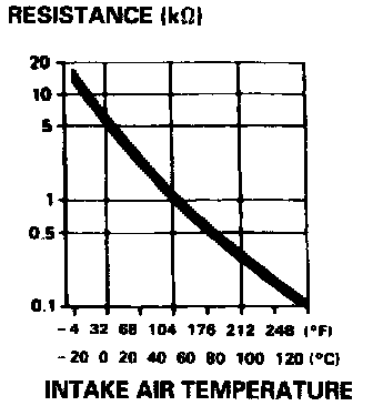 The IAT Sensor is a temperature dependant resistor (thermistor). The resistance of the thermistor decreases as the intake air temperature increases as shown above.
