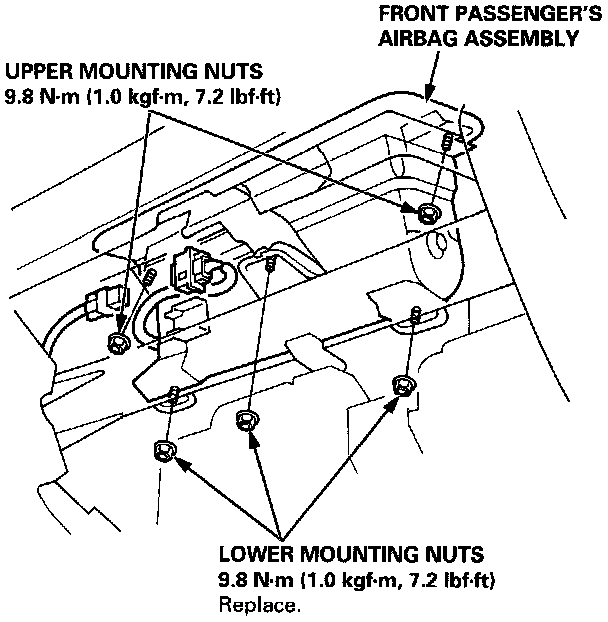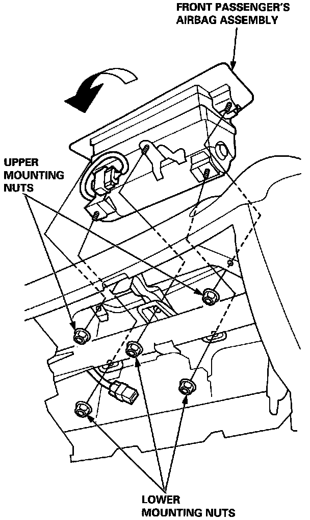 Remove the five mounting nuts, then lift the front passenger's airbag out of the dashboard.