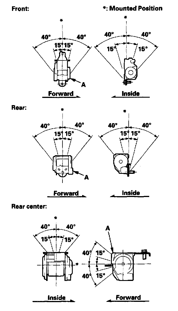 2. Make sure the seat belt does not lock when the retractor (A) is leaned slowly up to 15 ° from the mounted position. The seat belt should lock when the retractor is leaned over 40 °. Do not attempt to disassemble the retractor.