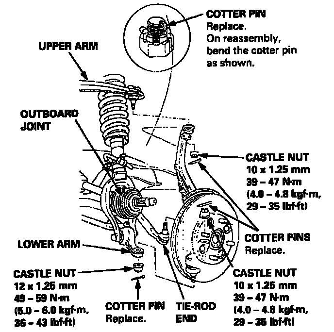 2. Install the knuckle on the tie-rod end, upper arm and lower arm, then tighten the castle nuts and install the new cotter pins.