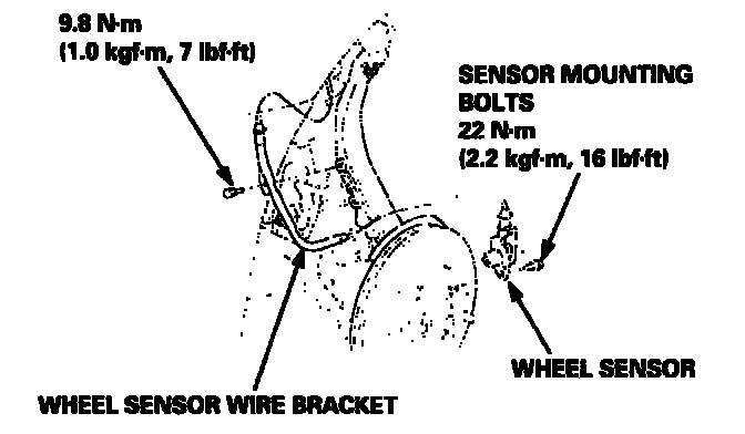 5. Install the wheel sensor wire bracket with the two flange bolts (for cars with ABS).