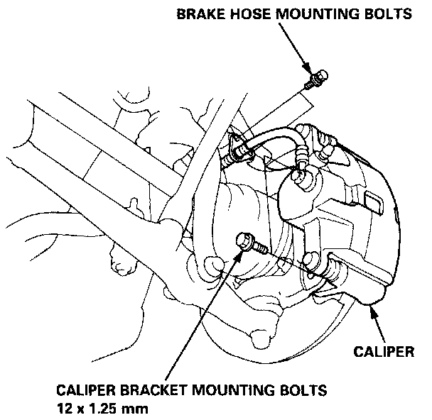 CAUTION: To prevent accidental damage to the caliper or brake hose, use a short piece of wire to hang the caliper from the undercarriage.