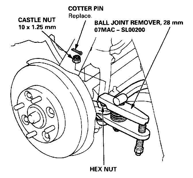 21. Install a 10 mm hex nut on the ball joint. Be sure that the hex nut is flush with the ball joint pin end, or the threaded section of the ball joint pin might be damaged by the ball joint remover.