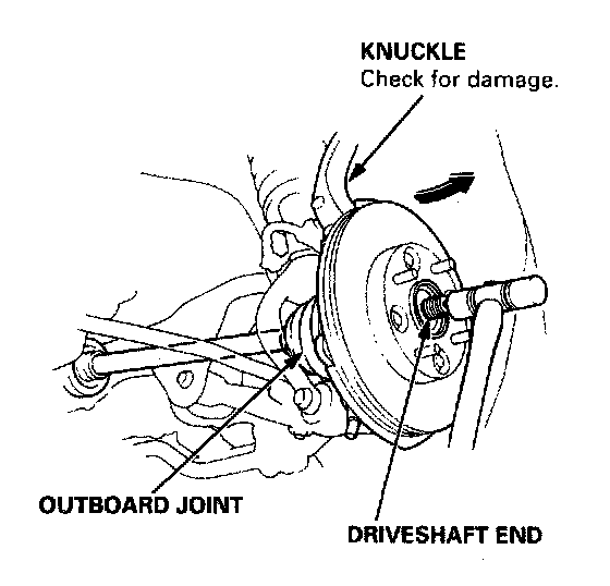 23. Pull the knuckle outward and remove the driveshaft outboard joint from the knuckle by tapping the driveshaft end using a plastic hammer, then remove the knuckle.