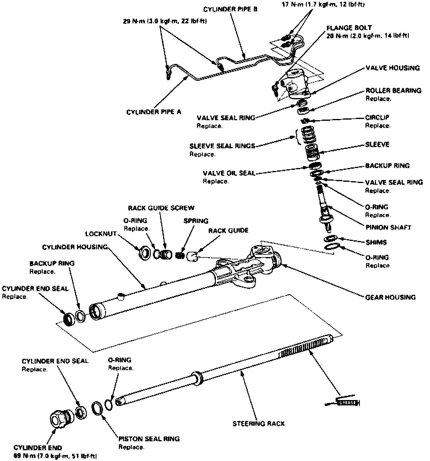 15. Remove 12 mm bolt and nut from steering rack, then the cylinder end seal from steering rack.