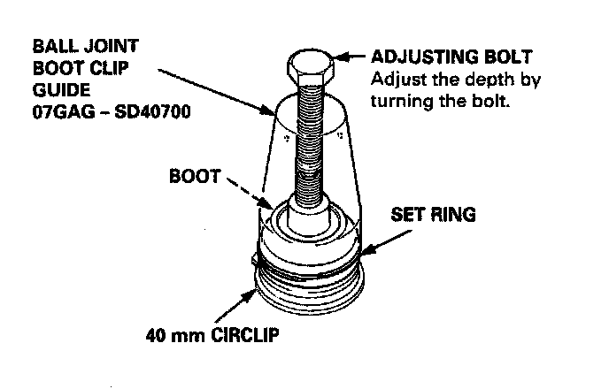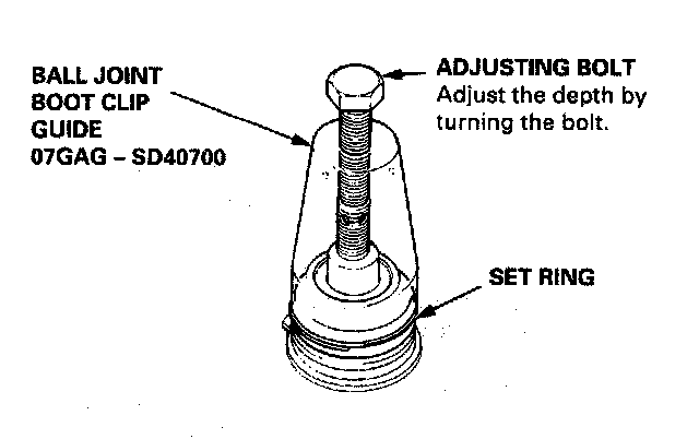 Lower ball joint: Adjust the special tool with the adjusting bolt until the end of the tool aligns with the groove on the boot. Slide the set ring over the tool and into position.