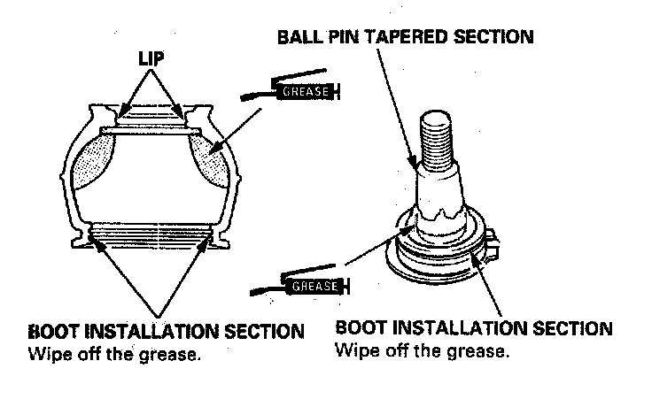 Keep grease off the boot installation section and the tapered section of the ball pin. Do not allow dust, dirt, or other foreign materials to enter the boot.