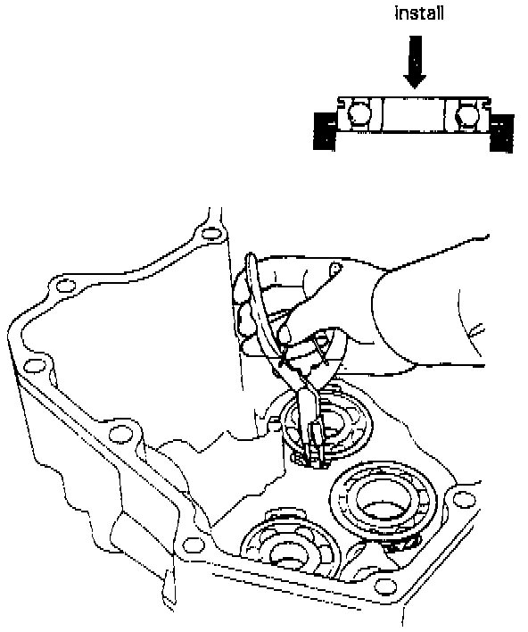 1. To remove the mainshaft, countershaft and secondary shaft bearings from the transmission housing, expand each snap ring with snap ring pliers, then push the bearing out.