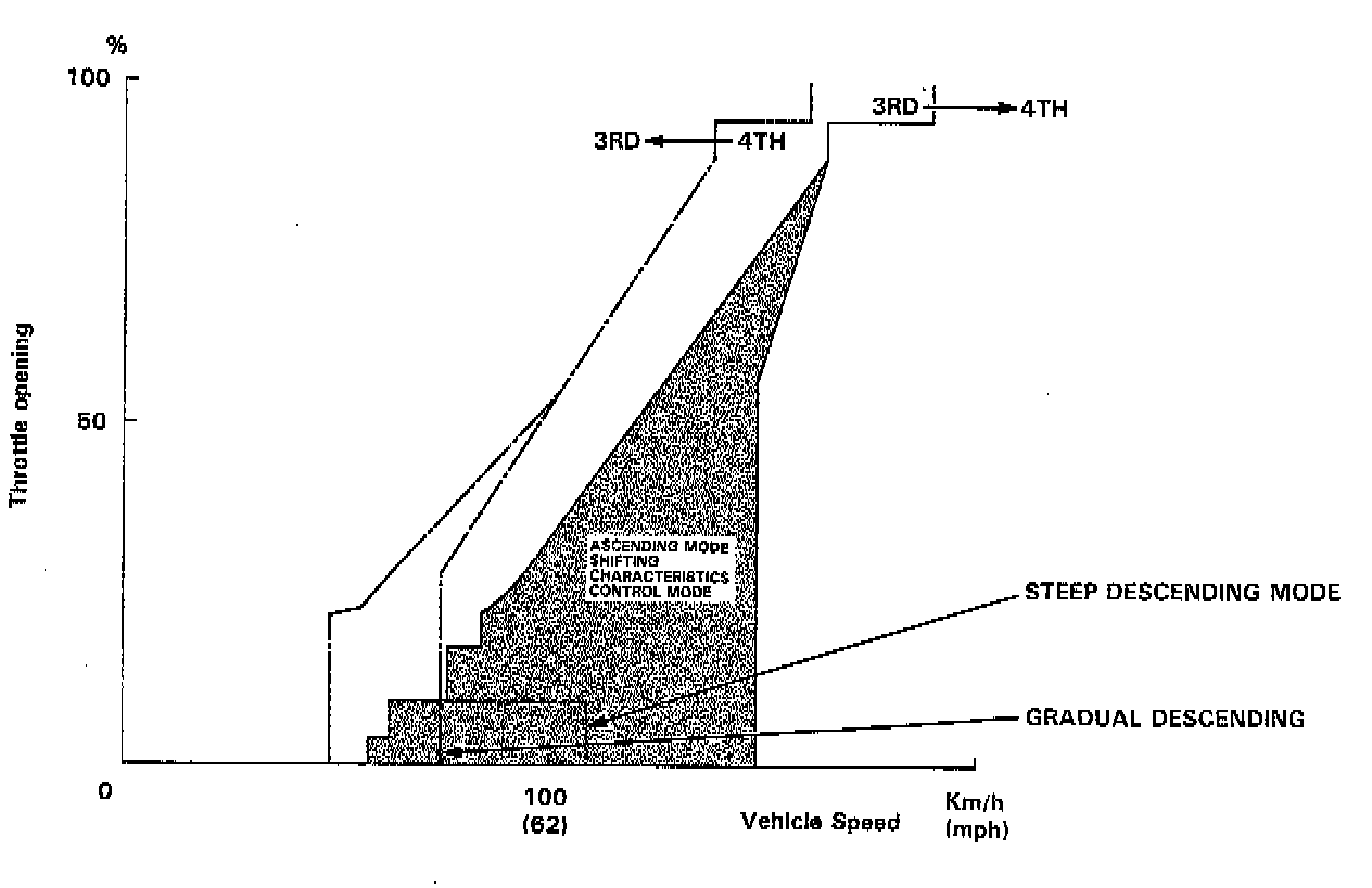 b. Descending Control - When the PCM determines that the vehicle is going down a hill in D4 position, the shift-up speed from 3rd to 4th gear when the throttle is closed becomes faster than the set speed for flat road driving to widen the 3rd gear driving area. This, in combination with engine braking from the deceleration lock-up, achieves smooth driving when the vehicle is descending. There are two descending modes with different 3rd gear driving areas according to the magnitude of a gradient stored in the PCM. When the vehicle is in 4th gear, and you are decelerating on a gradual hill, or when you are applying the brakes on a steep hill, the transmission will downshift to 3rd gear. When you accelerate, the transmission will then return to 4th gear.