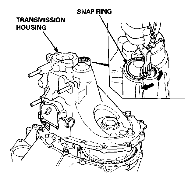 11. Set the stopper ring as shown. Place the transmission housing over the clutch housing, being careful to line up the shafts.