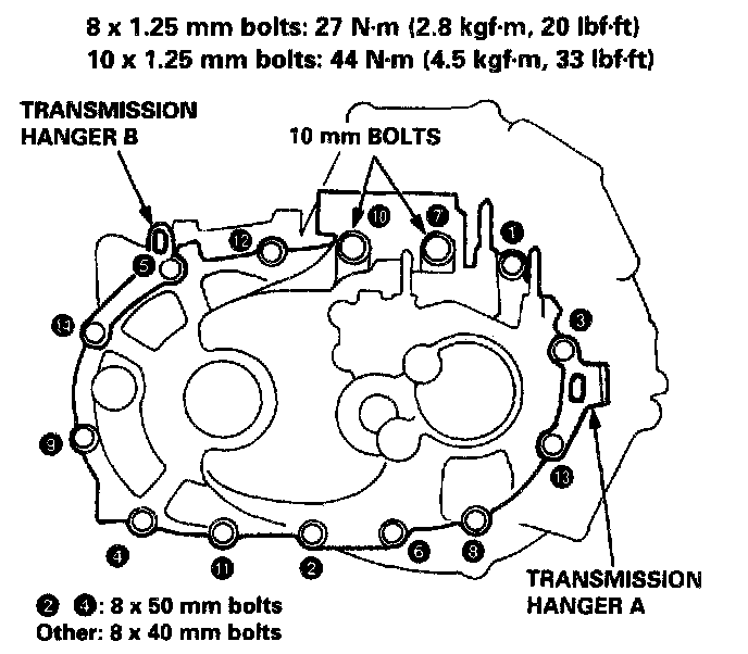 15. Install transmission hangers A and B, then tighten the bolts in a crisscross pattern in several steps as shown.