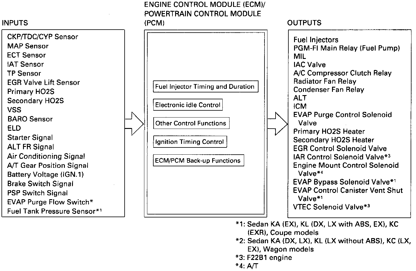 When an abnormality occurs in the ECM/PCM itself, the fuel injectors are controlled by a back-up circuit independent of the system in order to permit minimal driving.