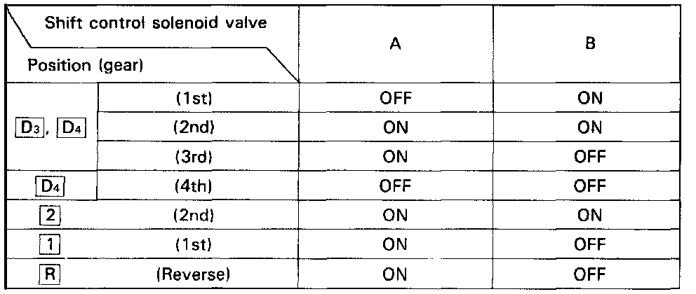 From sensor input signals, the PCM determines whether to turn the lock-up ON or OFF and activates lock-up control solenoid valve A and/or B accordingly. The combination of driving signals to lock-up control solenoid valves A and B is shown in the table above.