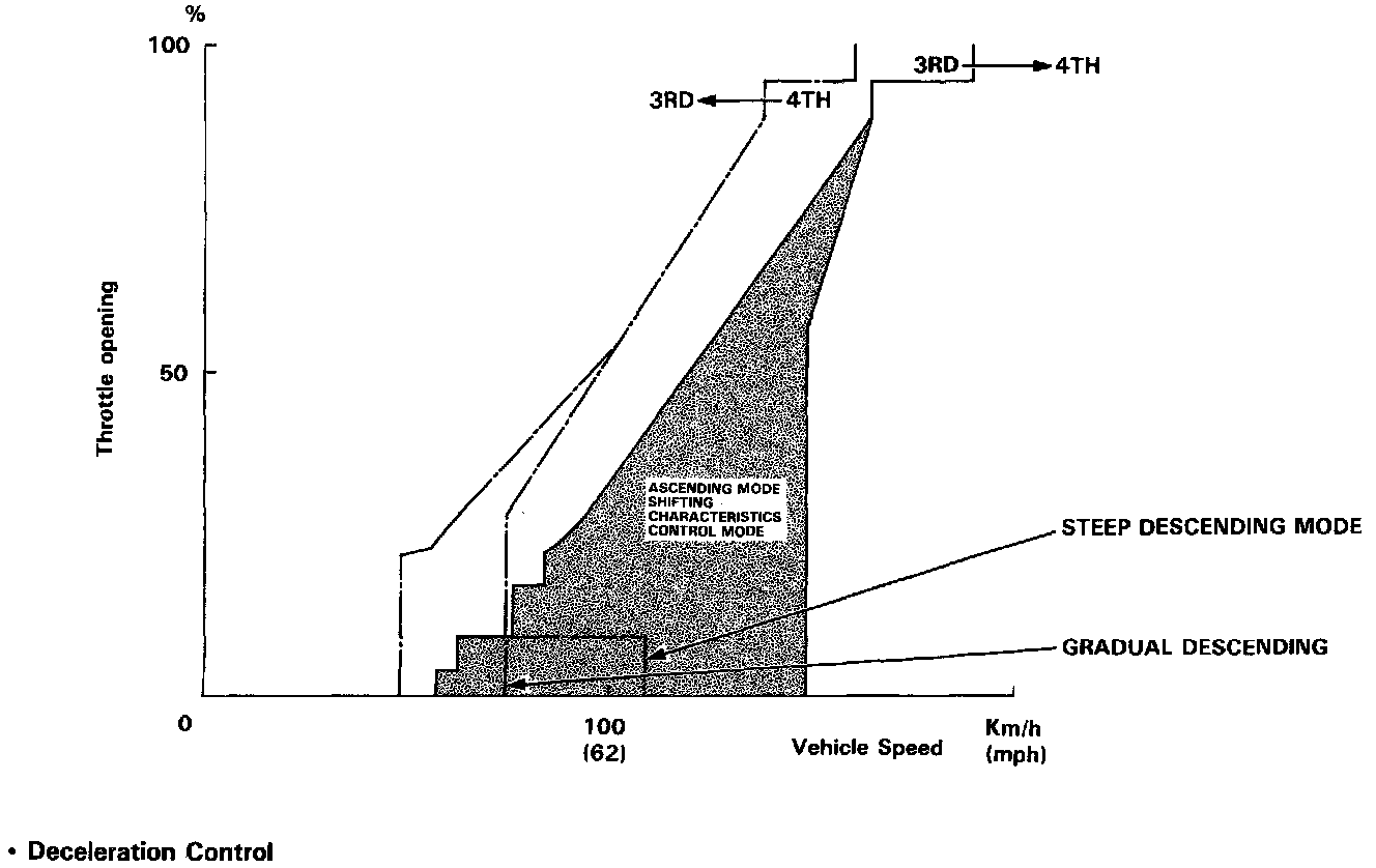 When the vehicle goes around a corner, and needs to decelerate first and then accelerate, the PCM sets the data for deceleration control to reduce the number of times the transmission shifts. When the vehicle is decelerating from speeds above 30 mph (48 km/h), the PCM shifts the transmission from 4th to 2nd earlier than normal to cope with upcoming acceleration.