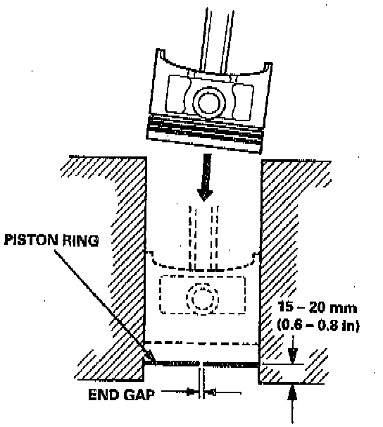 1. Using a piston, push a new ring into the cylinder bore 15-20 mm (0.6-0.8 inch) from the bottom.