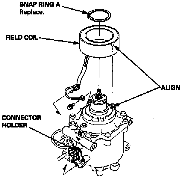 5. Remove snap ring A with snap ring pliers. Release the field coil connector from the connector holder, and disconnect the connector and field coil ground terminal. Remove the field coil from the compressor.