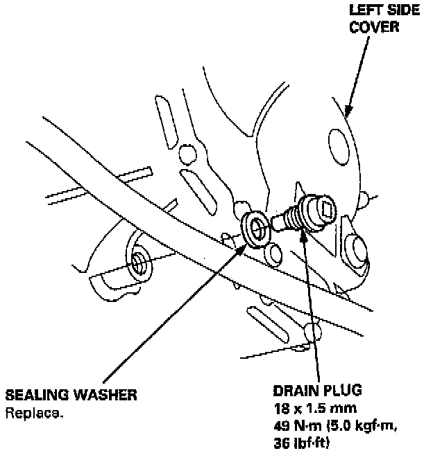 1. Bring the transmission up to normal operating temperature (the radiator fan comes on) by driving the vehicle. Park the vehicle on level ground, turn the engine off, and then remove the Automatic Transmission Fluid (ATF) filler bolt and drain plug.