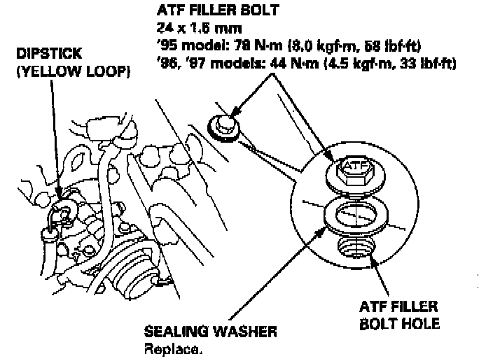 5. If the level is below the lower mark, pour the recommended fluid into the filler bolt hole to bring it to the upper mark.
