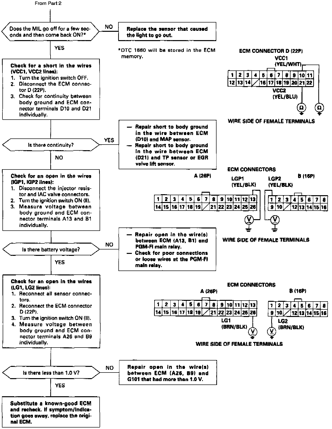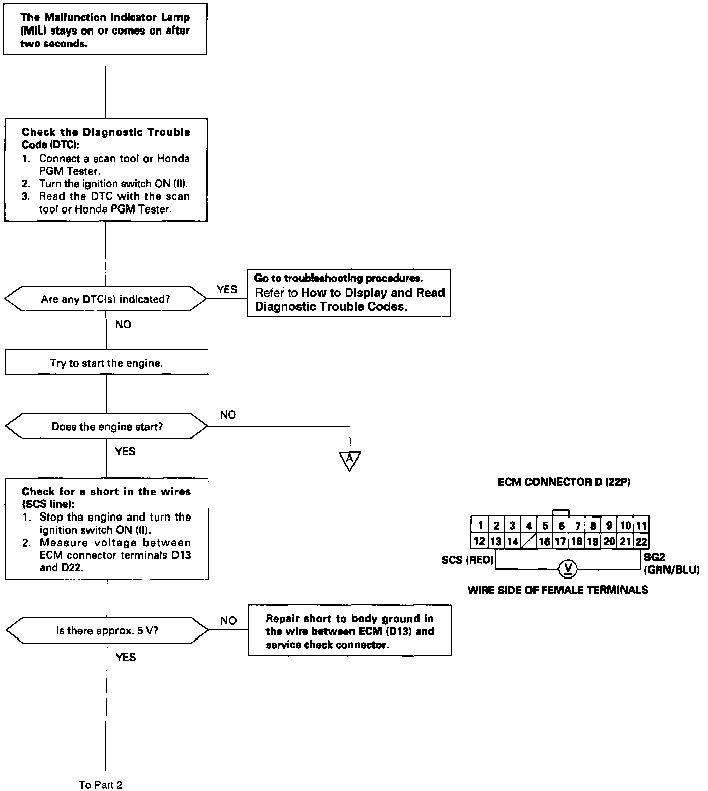 - An intermittent open in the wire between the ECM (D22) and the service check connector