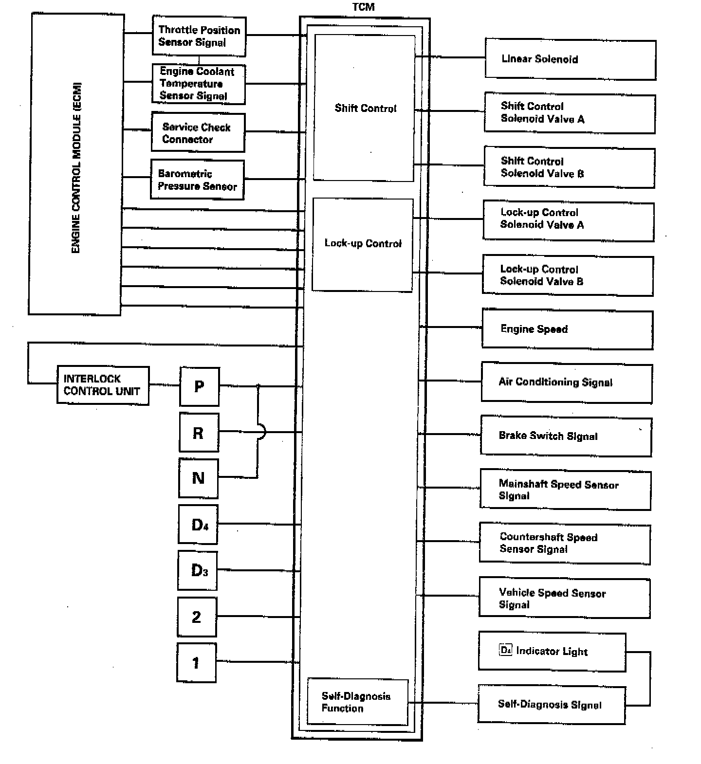 The electronic control system consists of the Transmission Control Module (TCM), sensors, a linear solenoid and four solenoid valves. Shifting and lock-up are electronically controlled for comfortable driving under all conditions. The TCM is located below the dashboard, under the front lower panel on the passenger's side.