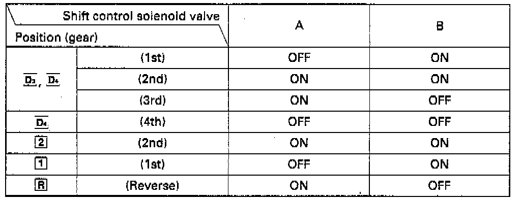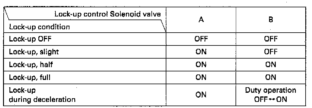 From sensor input signals, the TCM determines whether to turn the lock-up ON or OFF and activates lock-up control solenoid valve A and/or B accordingly. The combination of driving signals to lock-up control solenoid valves A and B is shown in the table below.
