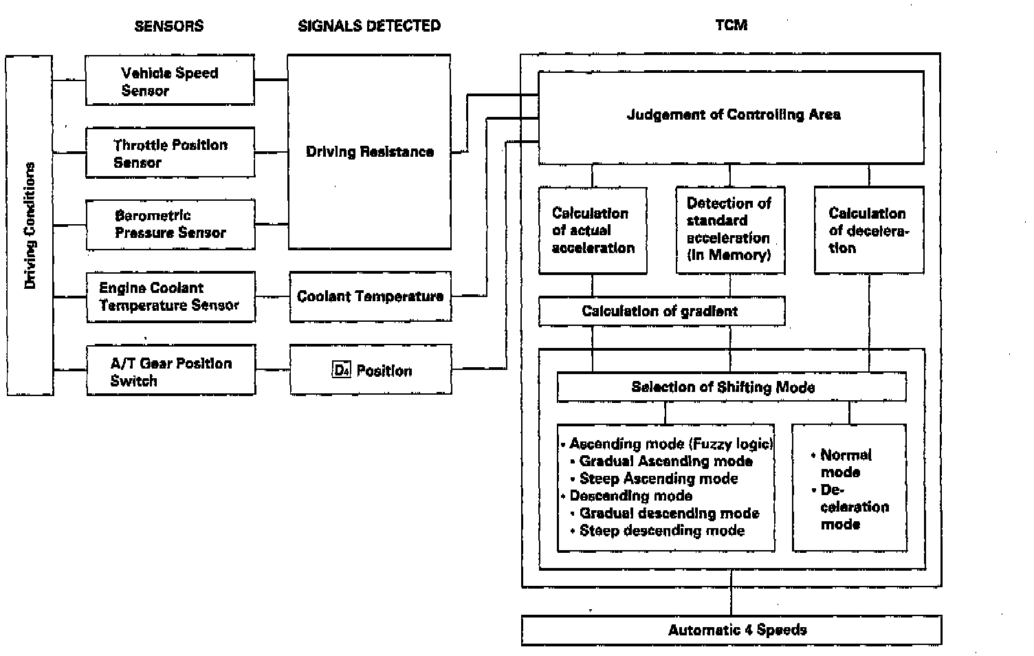 Shifting is related to engine torque through the linear solenoid used to operate the throttle valve which is controlled by the TCM. The TCM instantaneously determines which gear should be selected by various signals sent from sensors, and actuates the shift control solenoid valves A and B to control shifting. Also, a Grade Logic Control System has been adopted to control shifting in D4 position while the vehicle is ascending or descending a slope, or reducing speed.