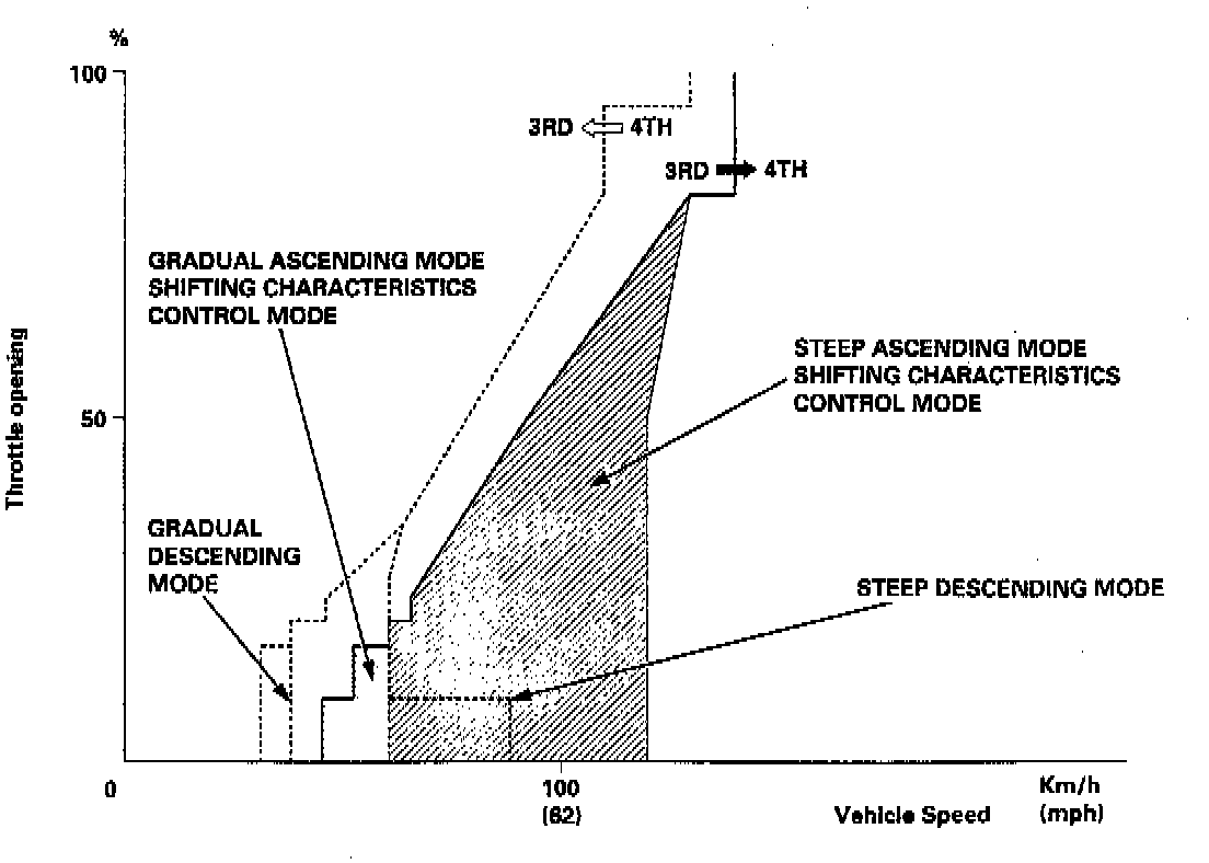 When the TCM determines that the vehicle is going down a hill in Liz position, the shift-up speed from 3rd to 4th gear when the throttle is closed becomes faster than the set speed for flat road driving to widen the 3rd gear driving area. This, in combination with engine braking from the deceleration lock-up, achieves smooth driving when the vehicle is descending. There are two descending modes with different 3rd gear driving areas according to the magnitude of a gradient stored in the TCM. When the vehicle is in 4th gear, and you are decelerating on a gradual hill, or when you are applying the brakes on a steep hill, the transmission will downshift to 3rd gear. When you accelerate, the transmission will then return to 4th gear.