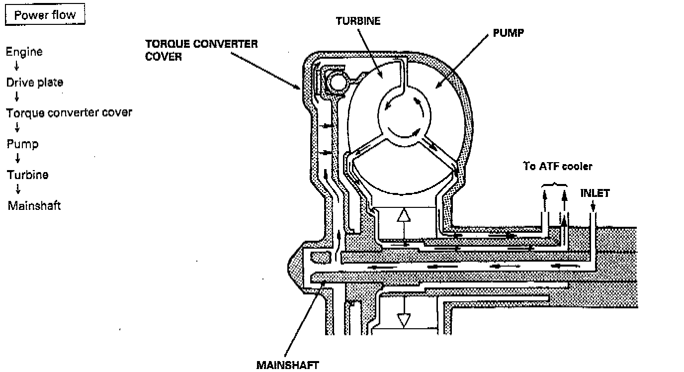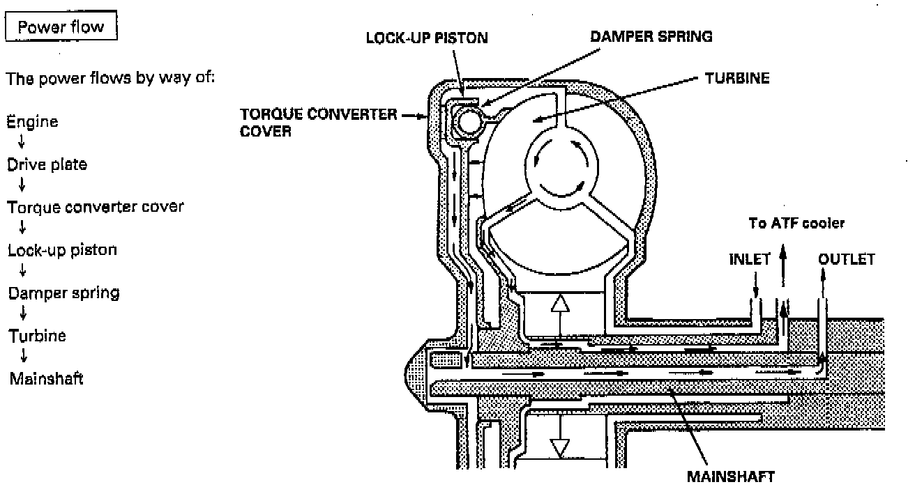 LOCK-UP CLUTCH1. Operation (clutch on): With the lock-up clutch on, the fluid in the chamber between the torque converter cover and lock-up piston is drained off, and the converter fluid exerts pressure through the piston against the torque converter cover. As a result, the converter turbine is locked to the converter cover. The effect is to bypass the converter, thereby placing the car in direct drive.