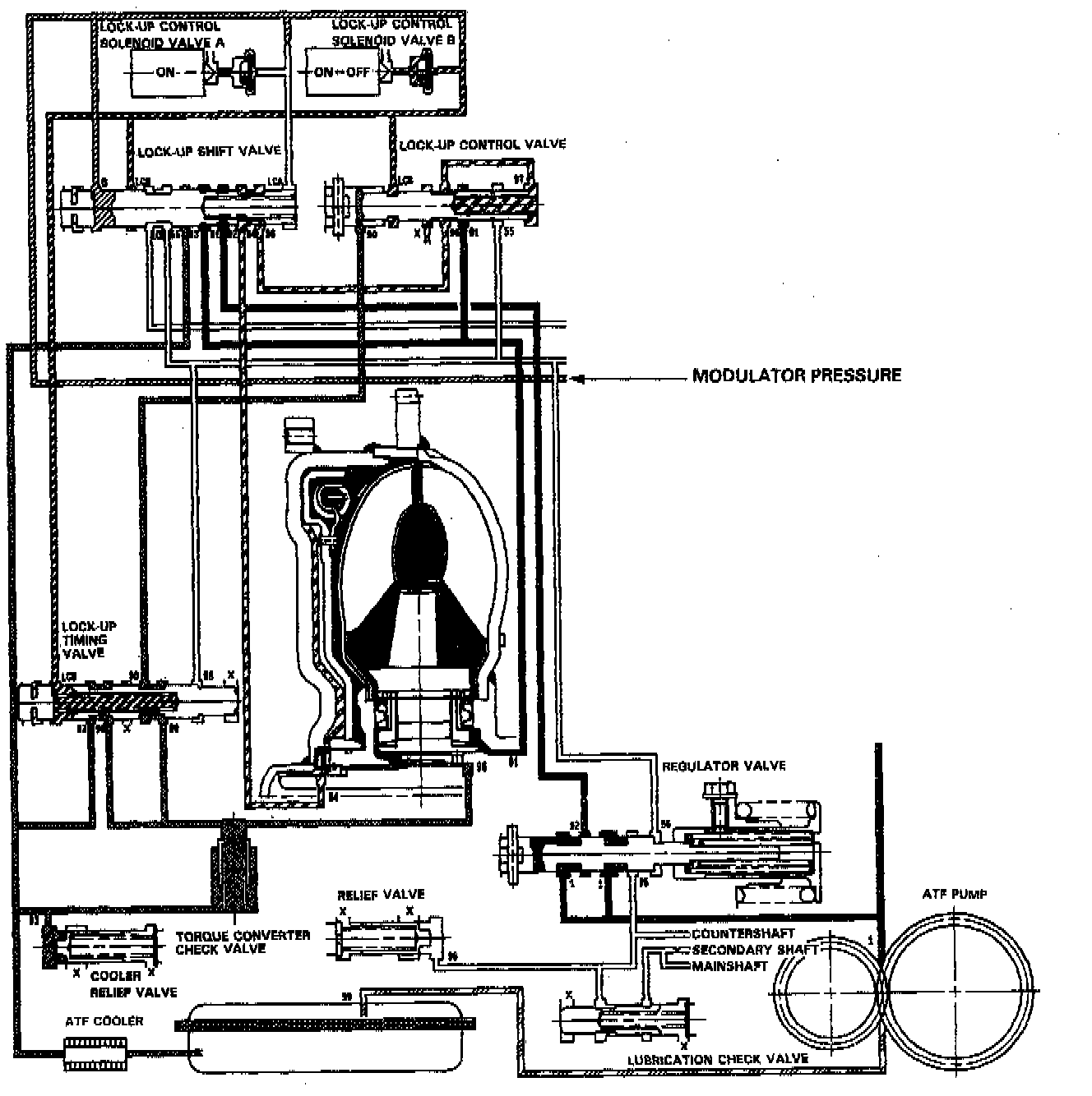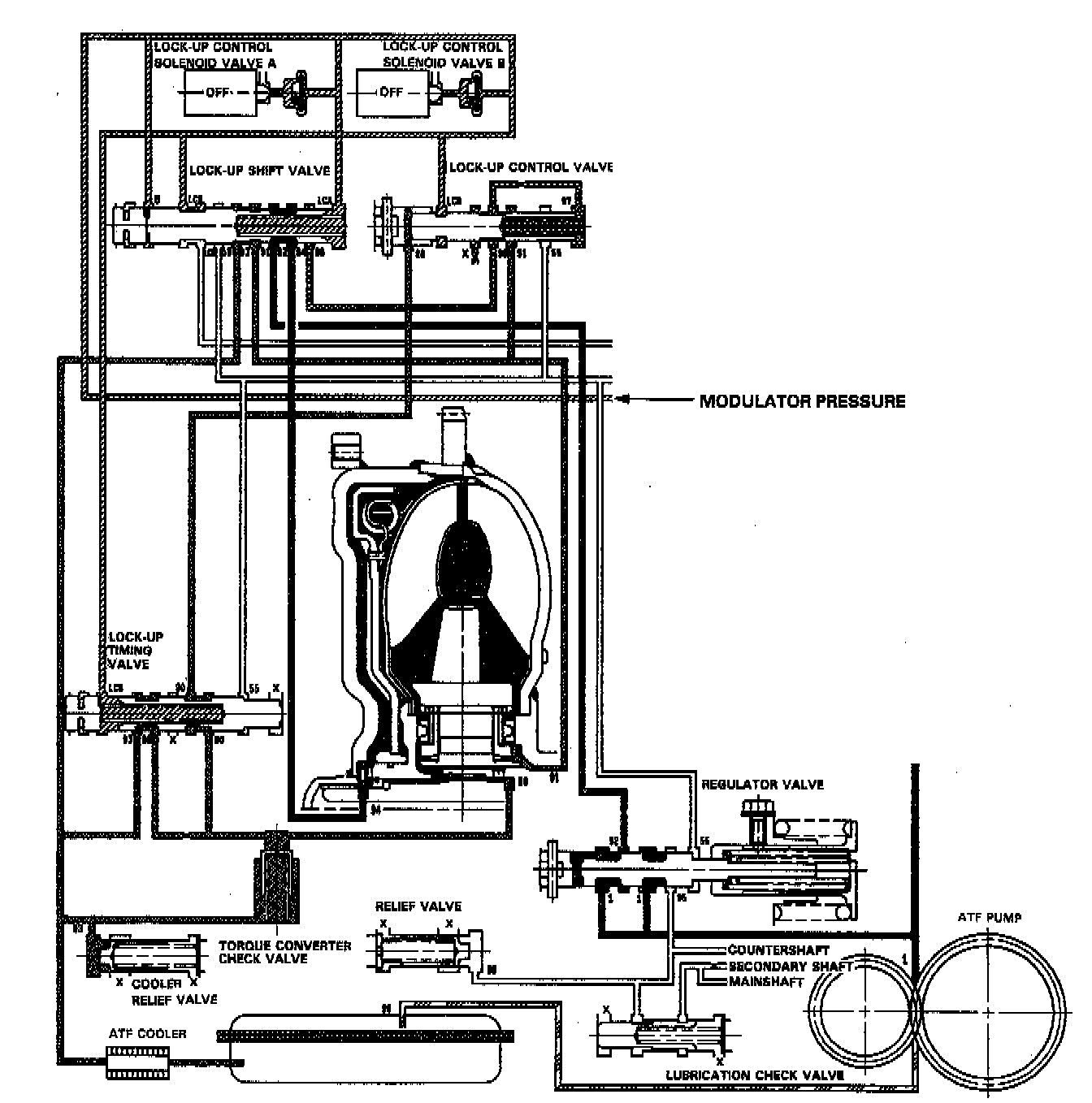 The modulator pressure flows to both side of the lock-up shift valve. The modulator pressure on both ends of the lock-up shift are equal and the lock-up shift valve is in the left side by the valve spring tension. The torque converter pressure (92) changes the torque converter pressure (94) at the lock-up shift valve. The torque converter pressure (94) flows through the left side of the lock-up clutch to the torque converter. The lock-up clutch is not engaged.