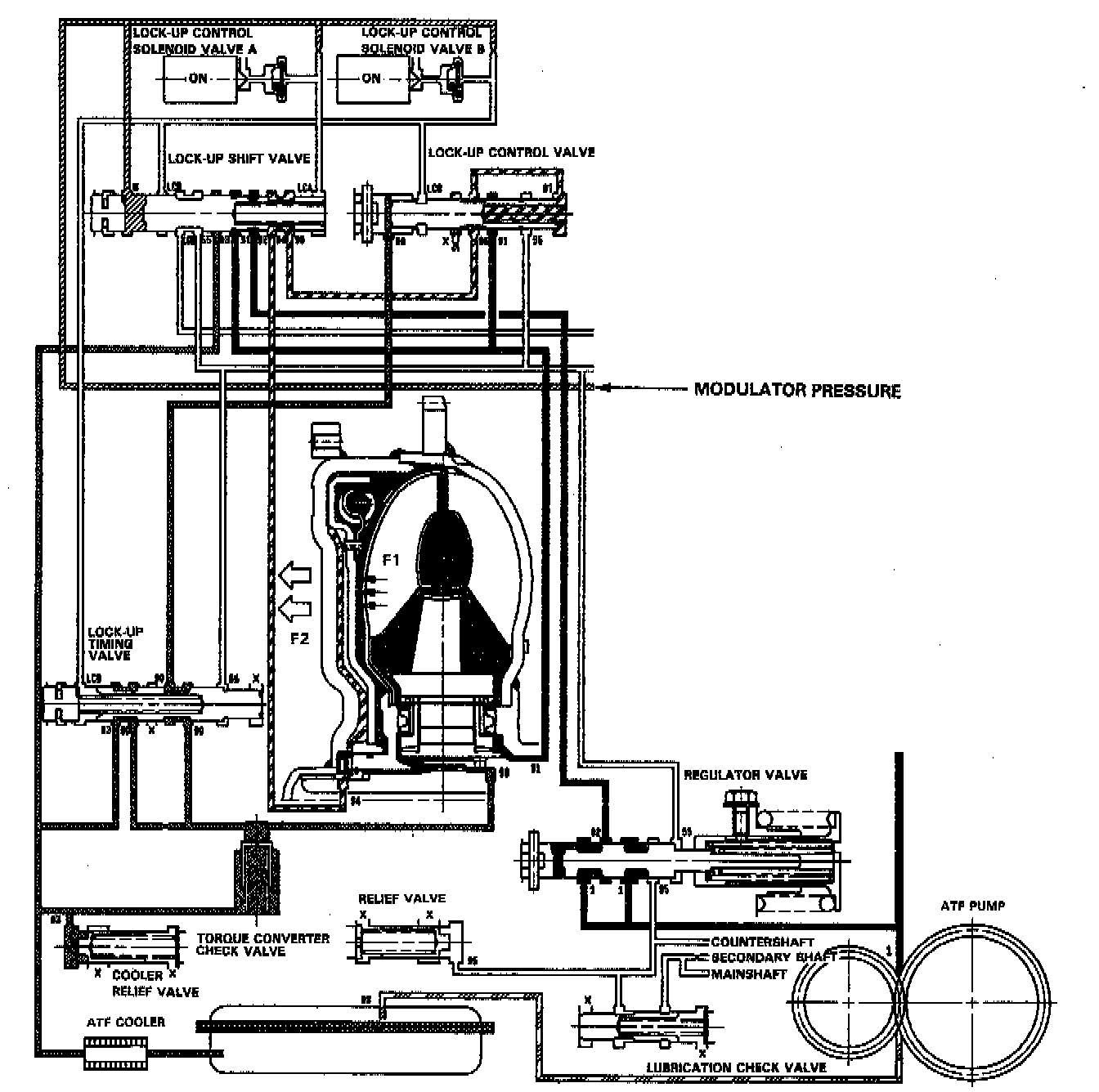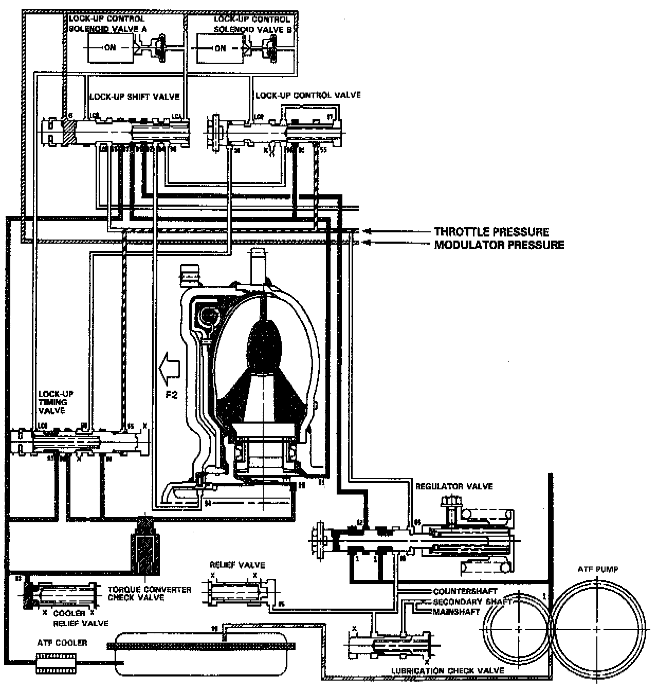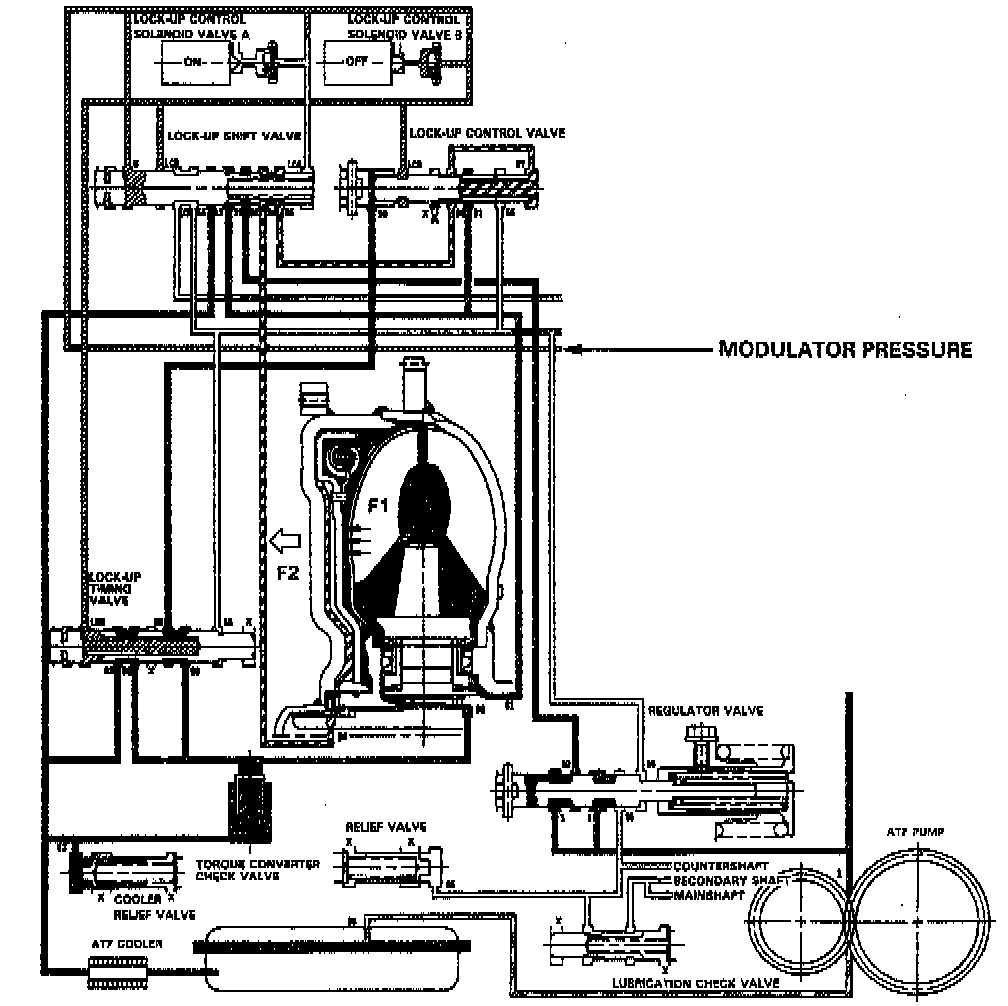 The back pressure (F2) of the torque converter is regulated by the lock-up control valve, and the position of the lock-up control valve is determined by the back pressure and the pressure from the lock-up timing valve. The position of the lockup timing valve is determined by the modulator pressure, throttle B pressure and the valve spring. The torque converter inner pressure slightly engages the lock-up clutch since the back pressure is not released by the position of the lock-up control valve.