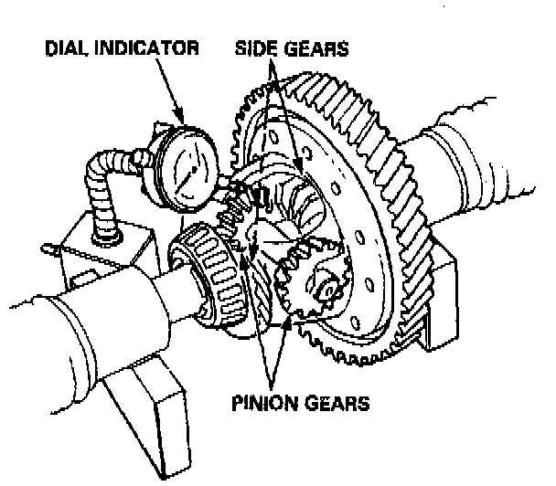 1. Place the differential assembly on V-blocks, and install both axles.2. Check the backlash of both side gears.