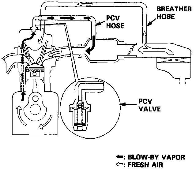 The Positive Crankcase Ventilation (PCV) system is designed to prevent blow-by gas from escaping to the atmosphere. The PCV valve contains a spring-loaded plunger. When the engine starts, the plunger in the PCV valve is lifted in proportion to intake manifold vacuum and the blow-by gas is drawn directly into the intake manifold.