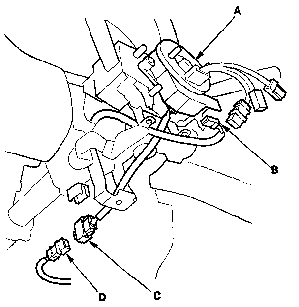 4. Carefully install the cable reel (A) on the steering column shaft. Then connect the 4P connector (B) to the cable reel, and connect the 2P connector (C) to the SRS main harness 2P connector (D).