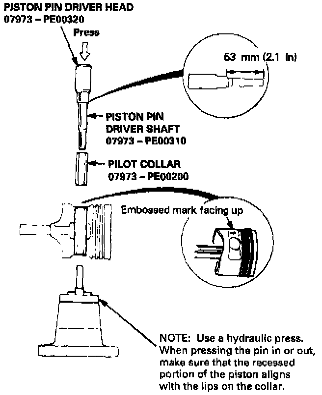 2. Assemble and adjust the length of the piston pin driver and shaft to 53 mm (2.1 inch) as shown.
