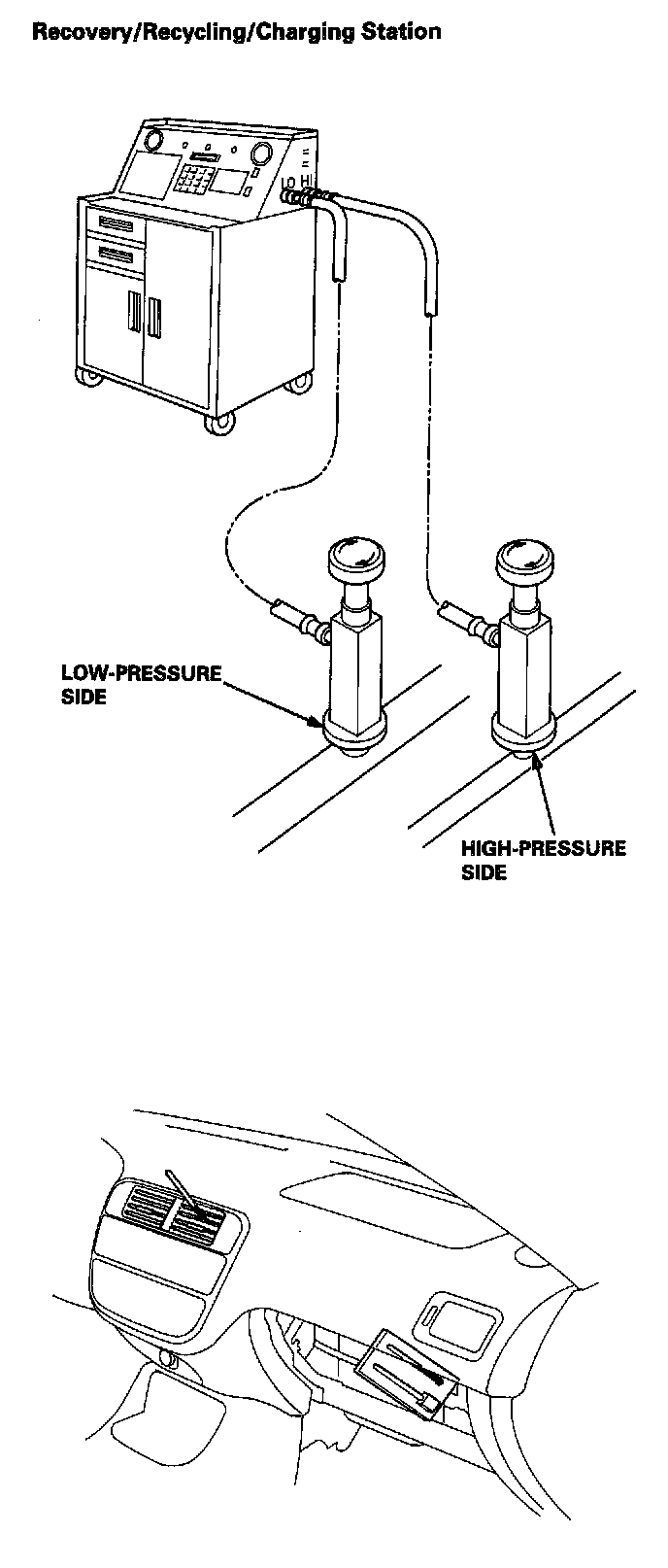1. Connect a R-134a refrigerant recovery/recycling/charging station to the vehicle, as shown, following the equipment manufacturer's instructions.