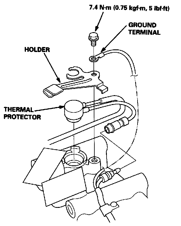 1. Remove the bolt, the ground terminal and the holder. Disconnect the field coil connector, then remove the thermal protector.