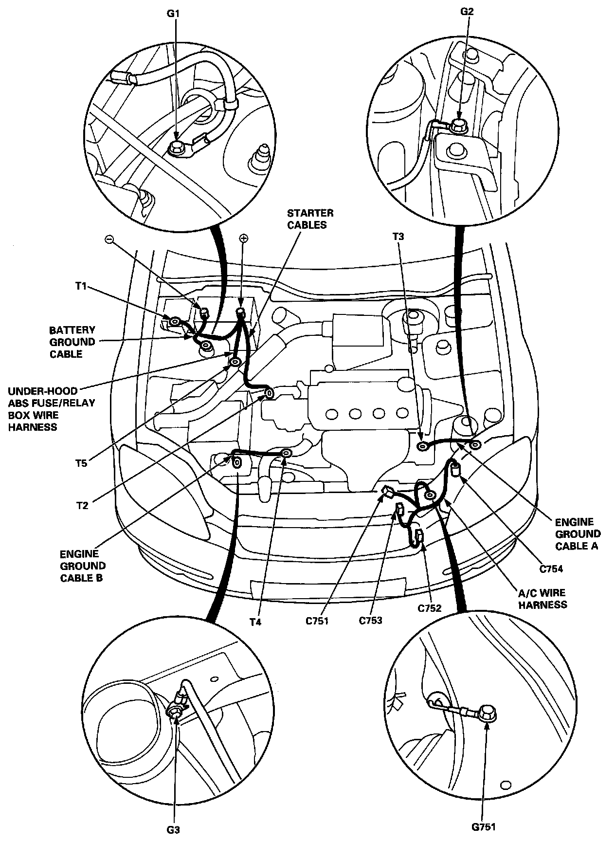 Starter Cables/Battery Ground Cable/Engine Ground Cable A, Engine Compartment Overview Of Power Terminals (T) And Grounds (G):