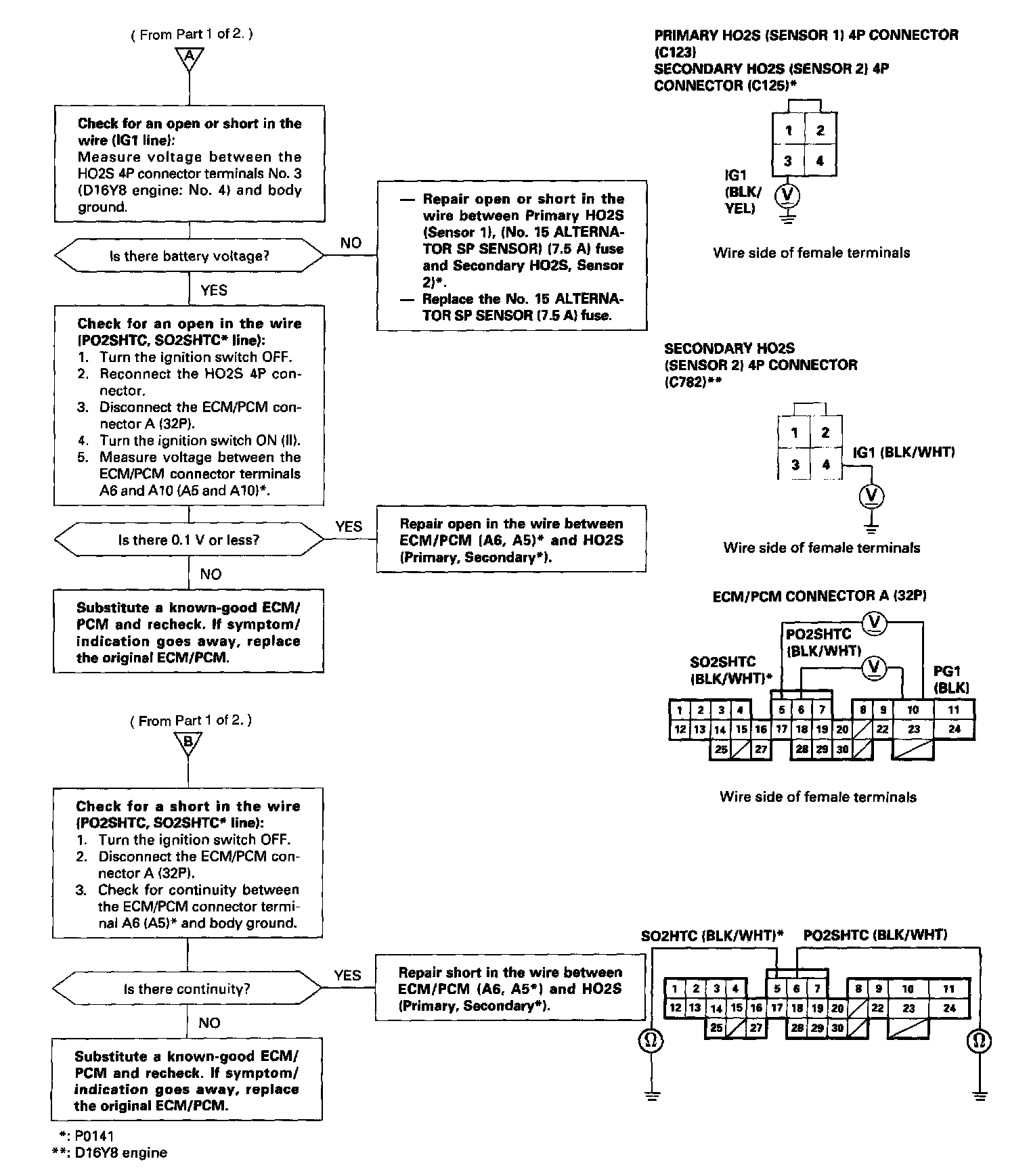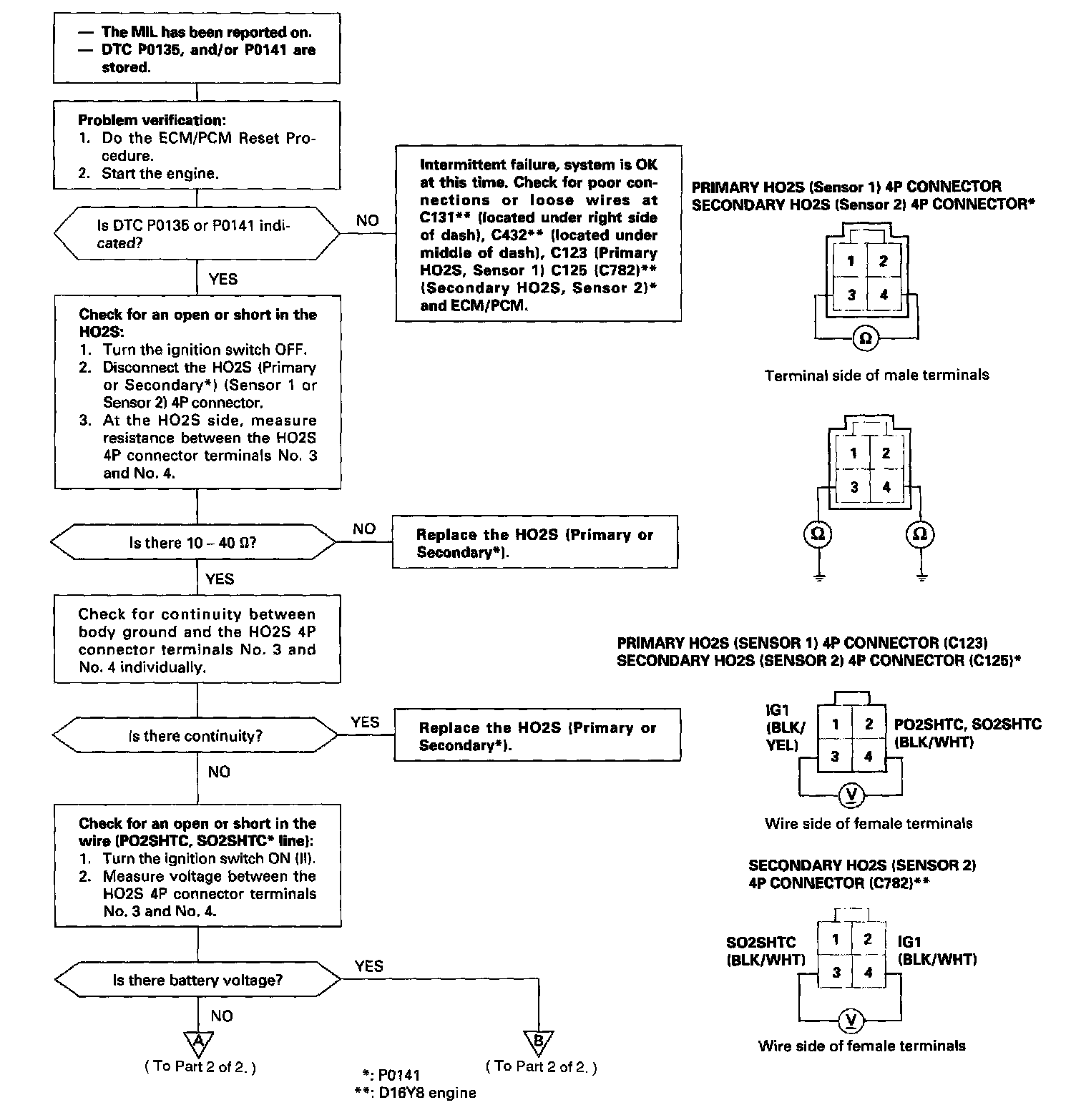 The scan tool indicates Diagnostic Trouble Code (DTC) P0135: An electrical problem in the Primary Heated Oxygen Sensor (Primary HO2S) (Sensor 1) Heater system. (Except D16Y5 engine with M/T)