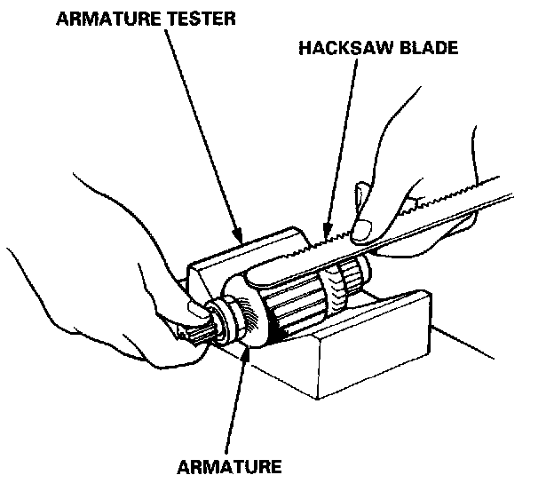 6. Place the armature on an armature tester. Hold a hacksaw blade on the armature core.