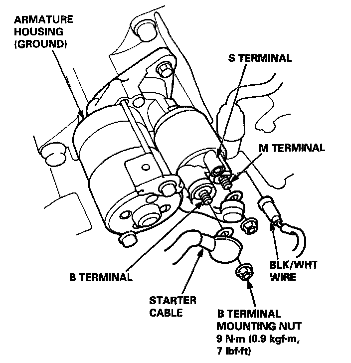 1. Check the hold-in coil for continuity between the S terminal and the armature housing (ground). The coil is OK if there is continuity.