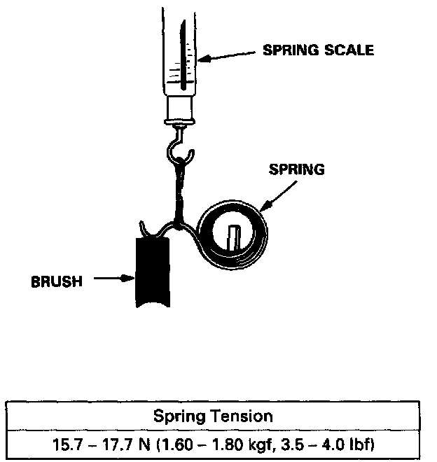 2. Insert the brush into the brush holder, and bring the brush into contact with the commutator, then attach a spring scale to the spring. Measure the spring tension at the moment the spring lifts off the brush.