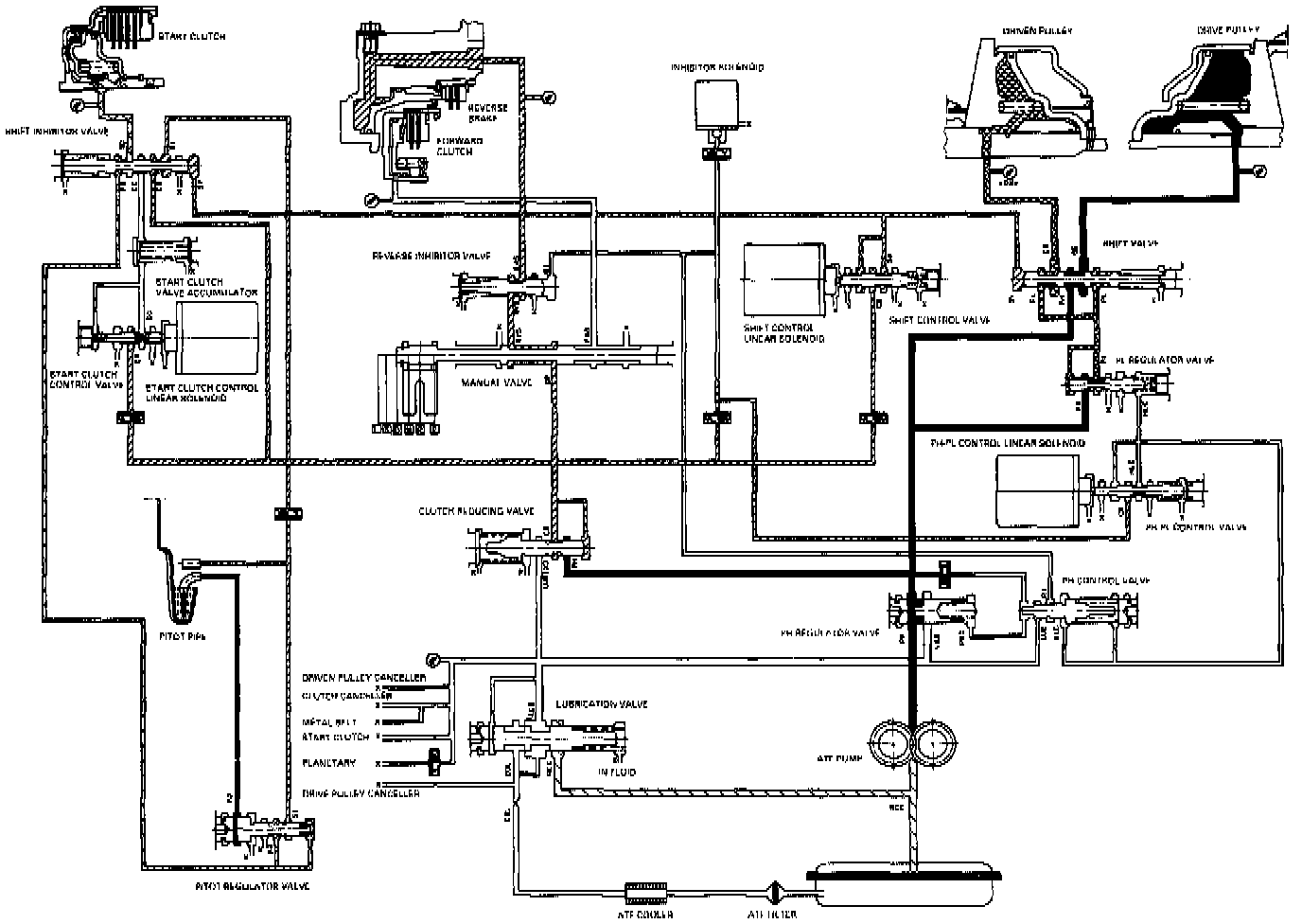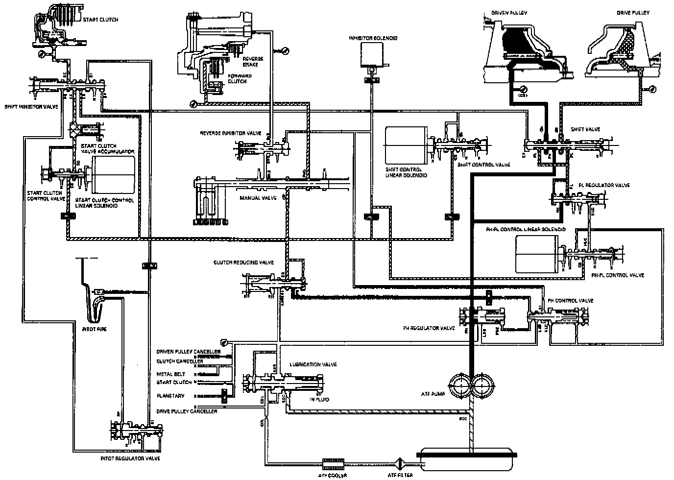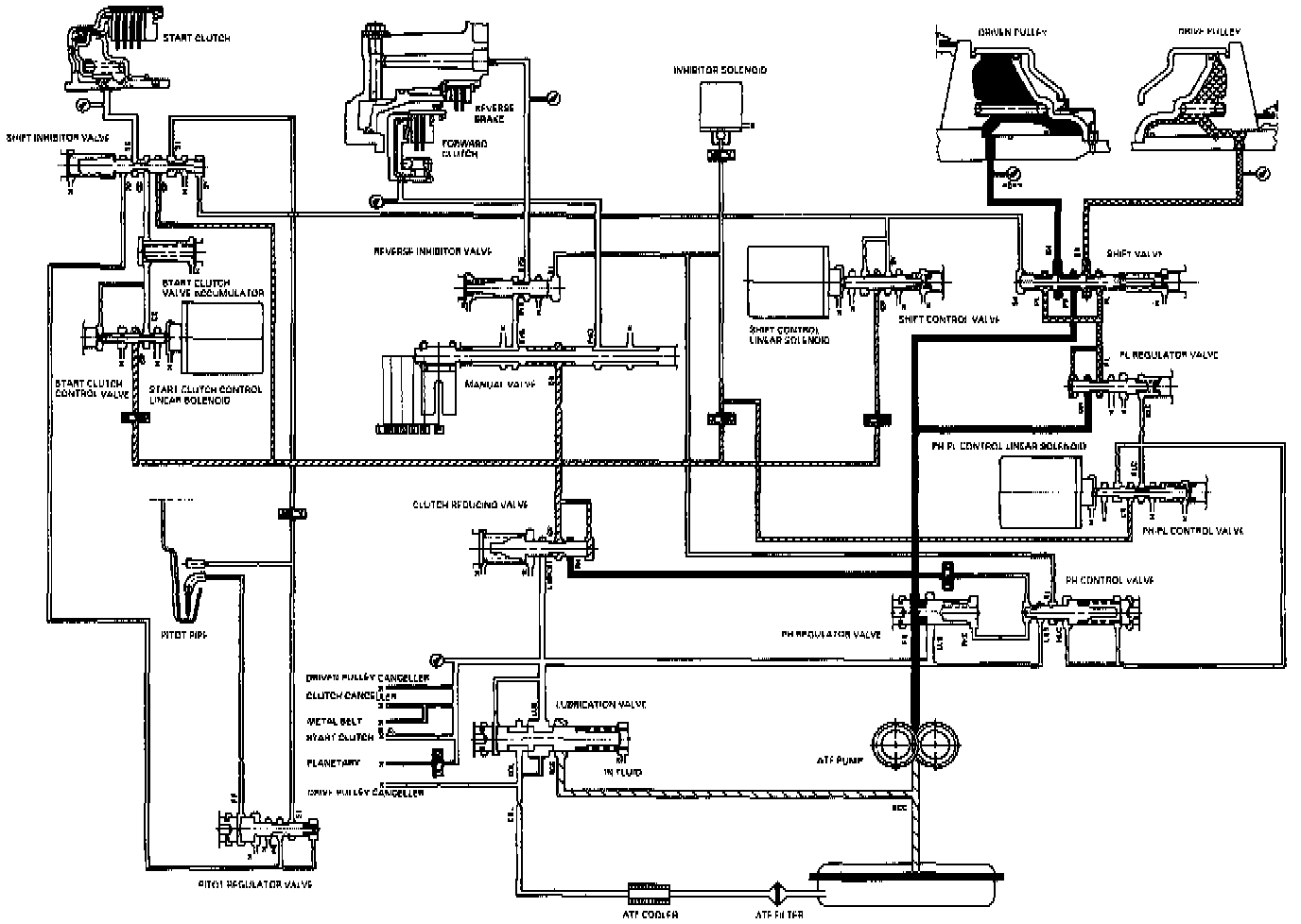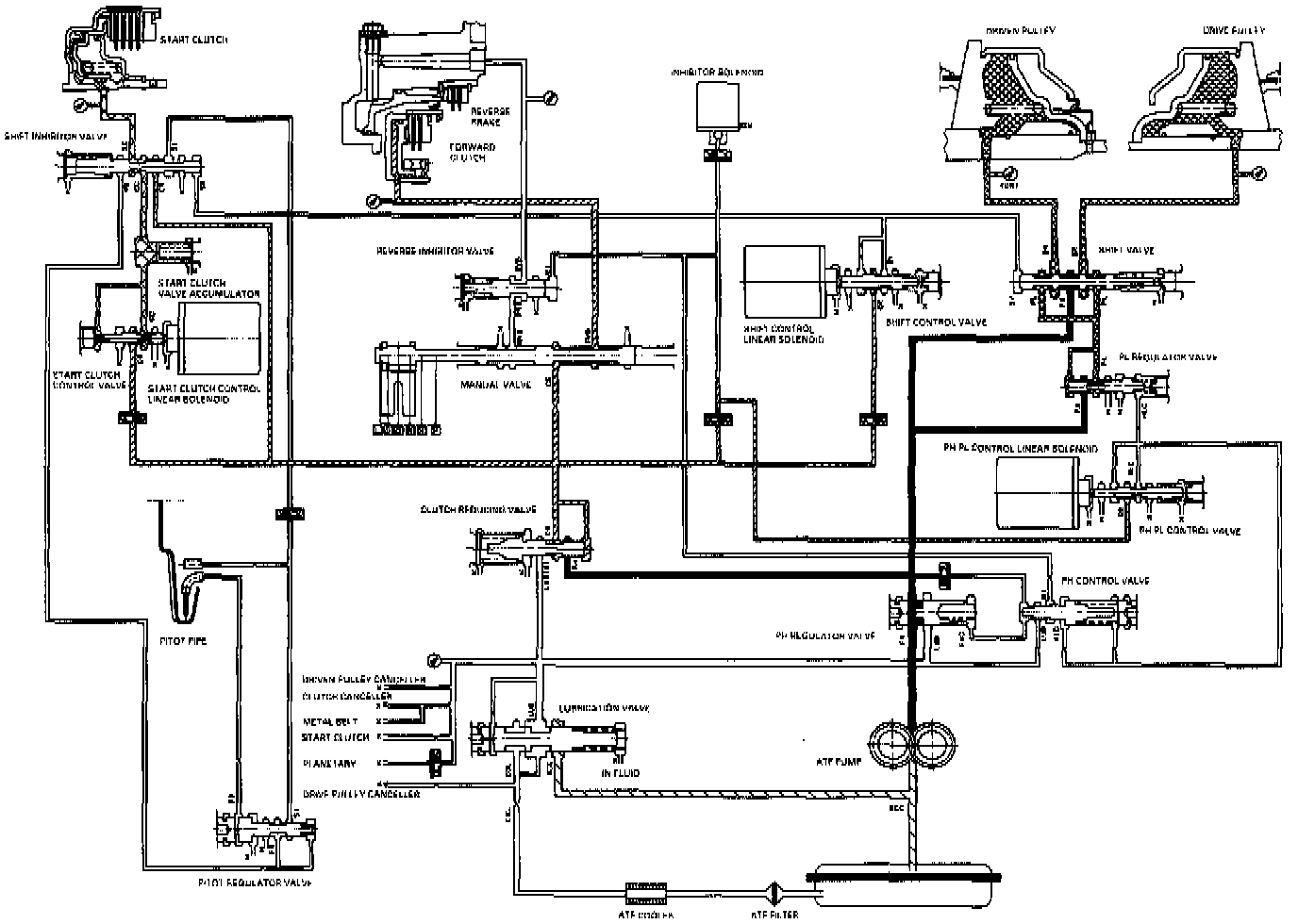 The hydraulic control system is controlled by the Automatic Transmission Fluid (ATF) pump, the valves, and the solenoids. The ATF pump is driven by the input shaft. The ATF pump and the input shaft are linked by the ATF pump drive chain and the sprockets. The inhibitor solenoid valve and the linear solenoids, which are located on their valve body, are controlled by the Transmission Control Module (TCM)or Powertrain Control Module (PCM). Fluid from the ATF pump flows through the Pressure High (PH)regulator valve to maintain specified pressure to the drive pulley, the driven pulley, and the manual valve.