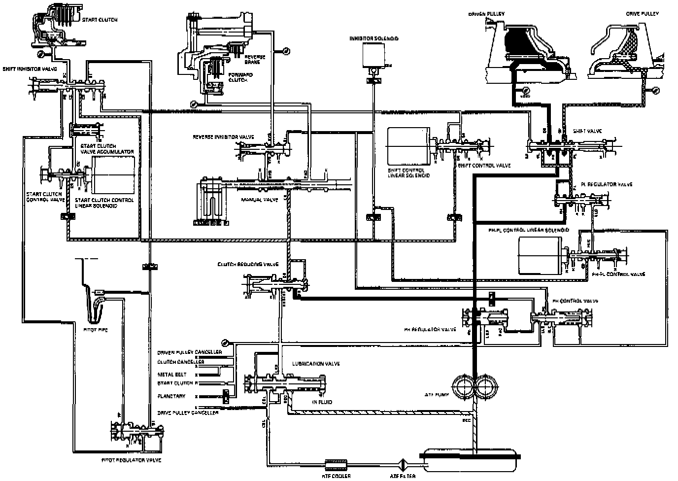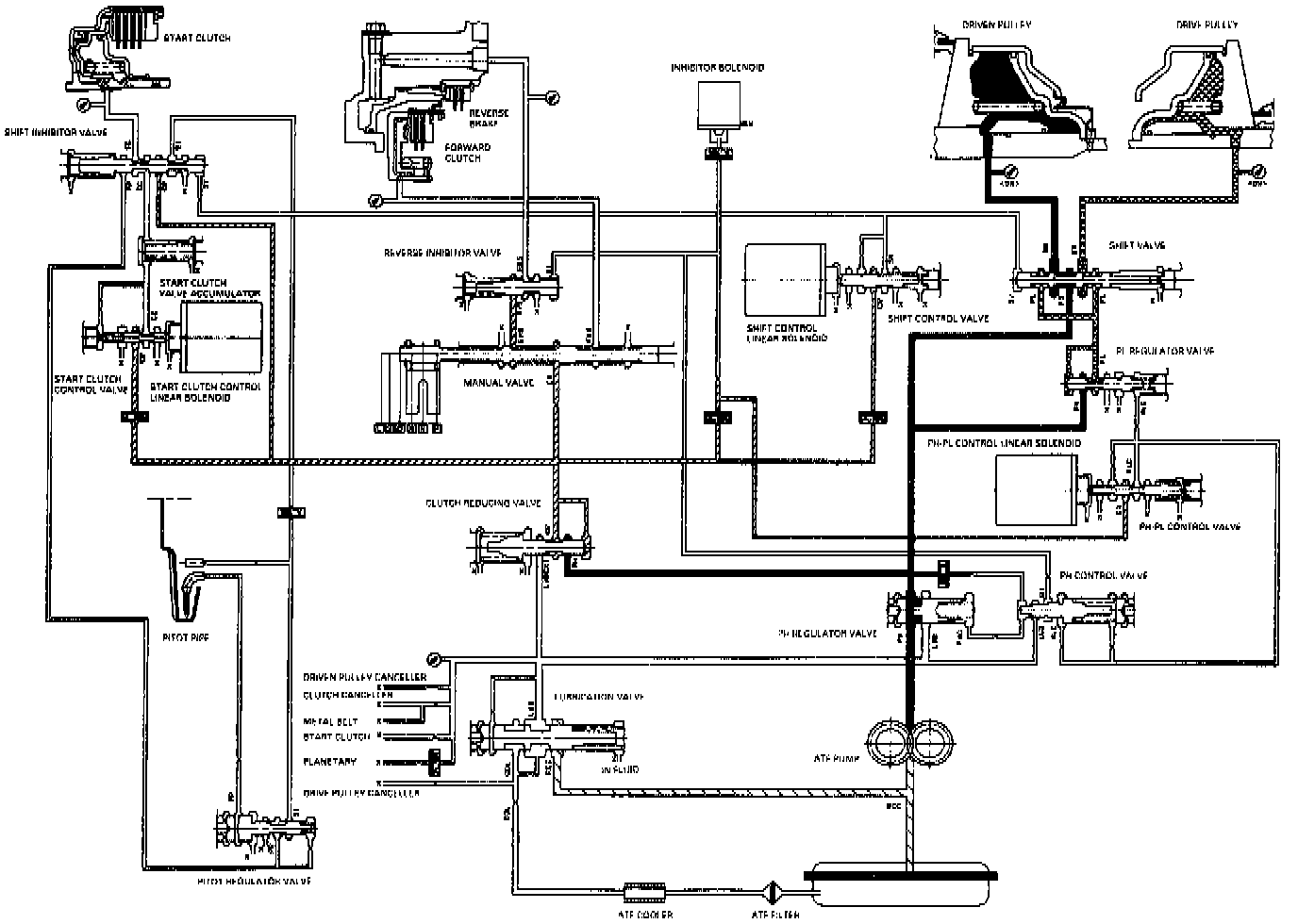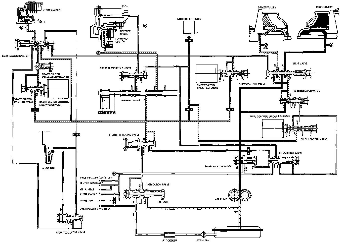 The hydraulic control system is controlled by the Automatic Transmission Fluid (ATF) pump, the valves, and the solenoids. The ATF pump is driven by the input shaft. The ATF pump and the input shaft are linked by the ATF pump drive chain and the sprockets. The inhibitor solenoid valve and the linear solenoids, which are located on their valve body, are controlled by the Transmission Control Module (TCM)or Powertrain Control Module (PCM). Fluid from the ATF pump flows through the Pressure High (PH)regulator valve to maintain specified pressure to the drive pulley, the driven pulley, and the manual valve.