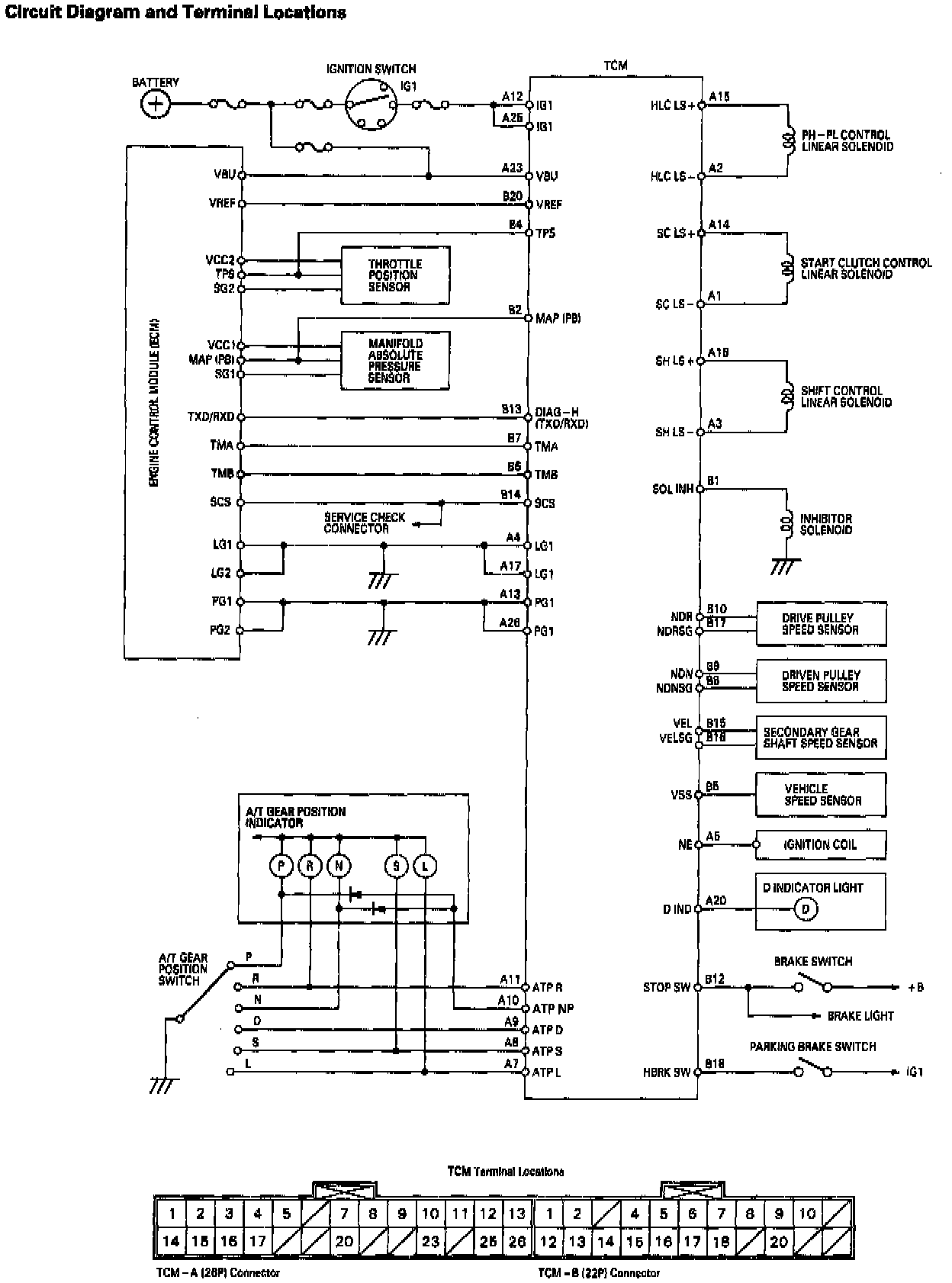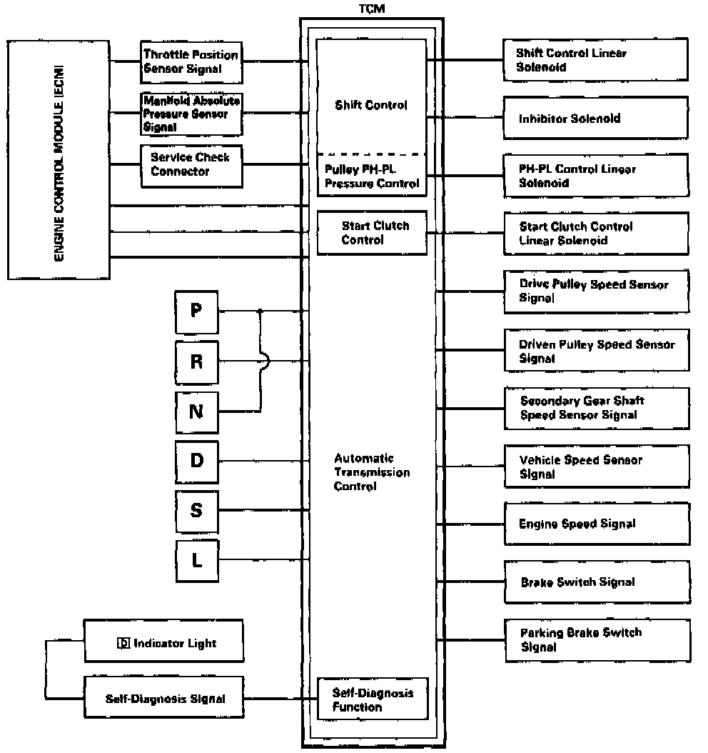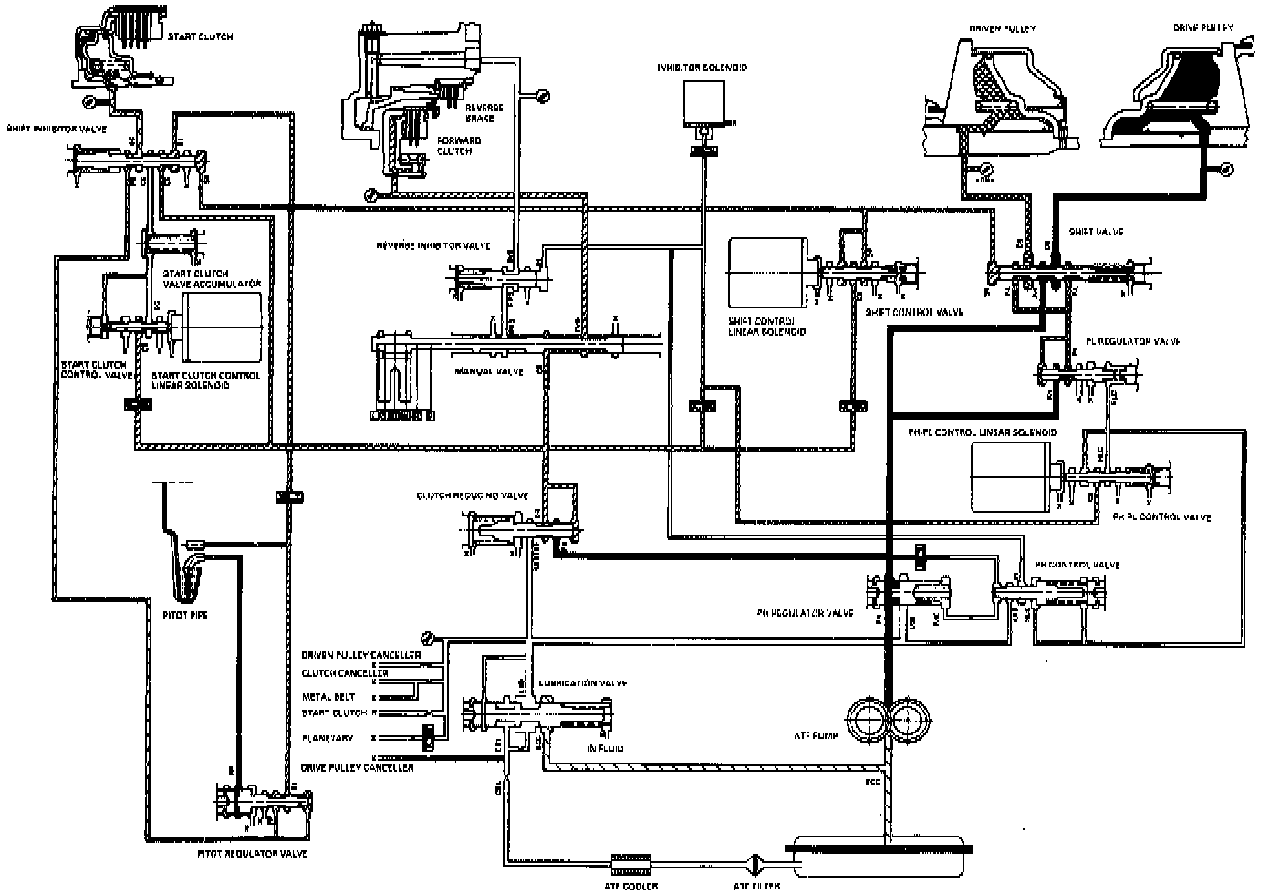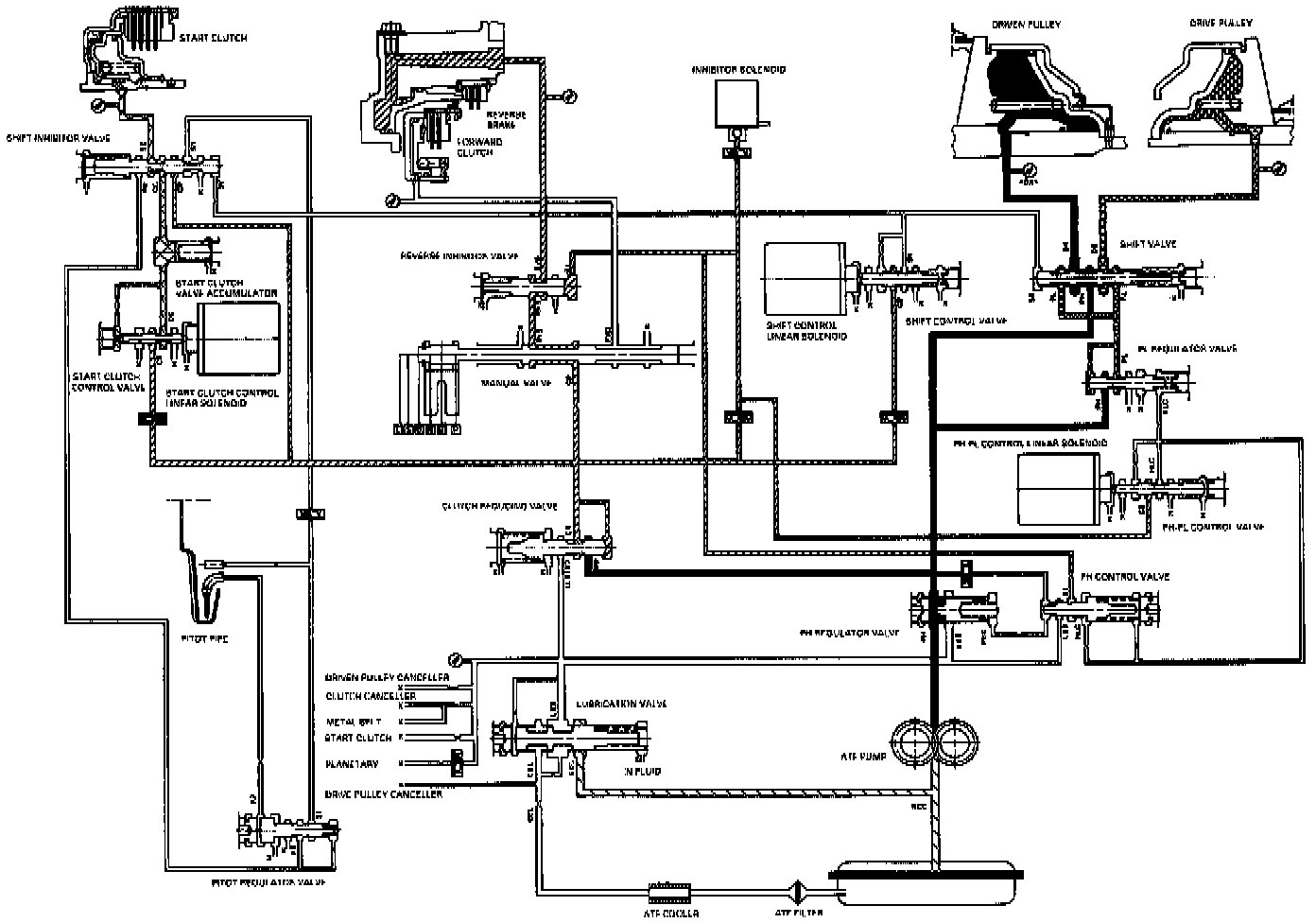 The hydraulic control system is controlled by the Automatic Transmission Fluid (ATF) pump, the valves, and the solenoids. The ATF pump is driven by the input shaft. The ATF pump and the input shaft are linked by the ATF pump drive chain and the sprockets. The inhibitor solenoid valve and the linear solenoids, which are located on their valve body, are controlled by the Transmission Control Module (TCM)or Powertrain Control Module (PCM). Fluid from the ATF pump flows through the Pressure High (PH)regulator valve to maintain specified pressure to the drive pulley, the driven pulley, and the manual valve.
