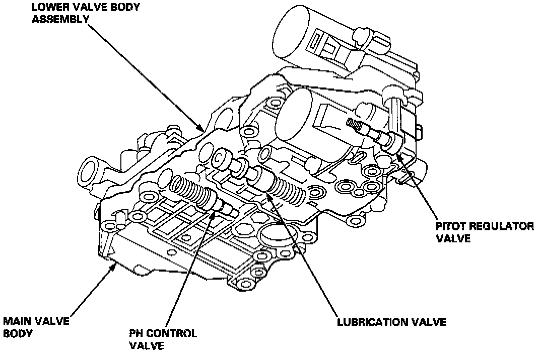 The Pressure Low (PL) regulator valve body contains the PL regulator valve and the Pressure High (PH)-PL control valve, which is joined with the PH-PL control linear solenoid. The inhibitor solenoid is bolted on the PL regulator valve body.