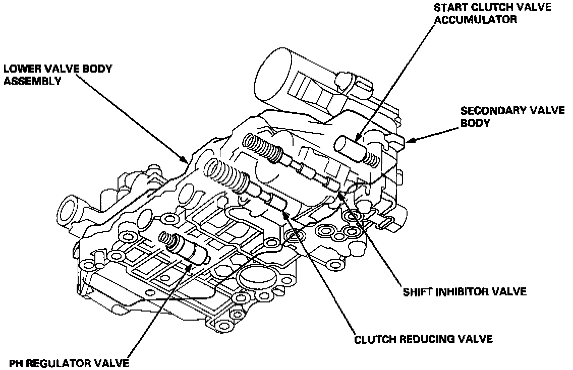 The secondary valve body contains the Pressure High (PH) regulator valve, the clutch reducing valve, the start clutch valve accumulator, and the shift inhibitor valve.