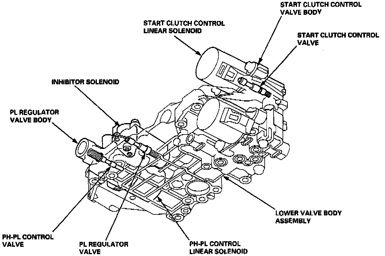 The start clutch control valve controls start clutch engagement according to the throttle opening. The start clutch control valve is controlled by the start clutch control linear solenoid, which is controlled by the Transmission Control Module (TCM) or Powertrain Control Module (PCM).
